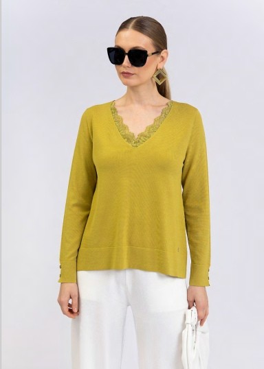 Suéter con escote en V con detalle de encaje, aportando un toque femenino y elegante, mangas largas con puños ajustados, terminadas con pequeños botones decorativos. Corte recto y suelto, ideal para un ajuste cómodo y fluido. Tejido ligero y suave, perfecto para entretiempo.