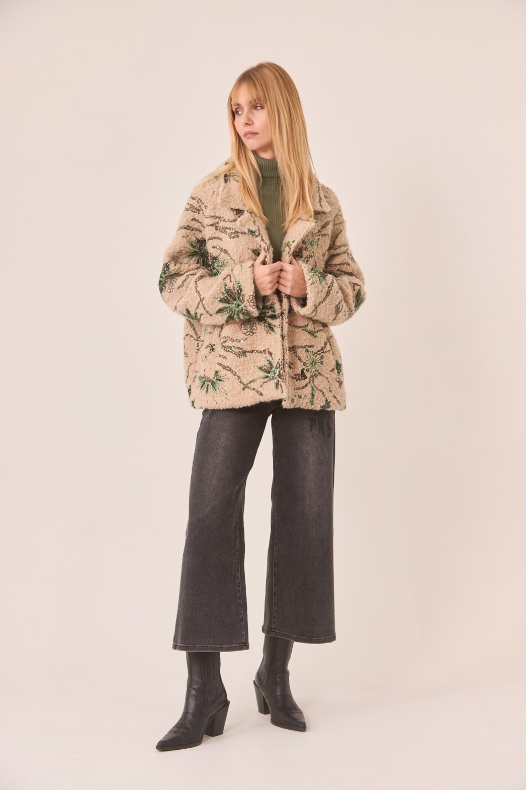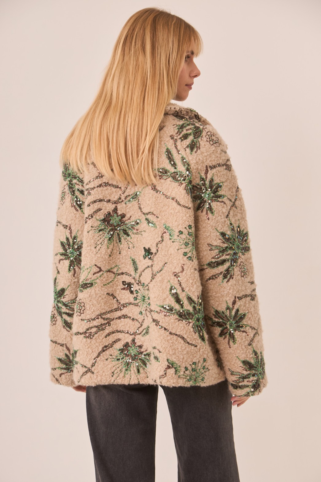 El abrigo tiene un diseño relajado y amplio, con un corte que le da un toque de elegancia y comodidad al mismo tiempo. Está confeccionado con un tejido suave y texturizado, de color beige claro, que contrasta con los detalles de bordado en tonos verdes y marrones. Los bordados forman un patrón de hojas y ramas, decorados con pequeños brillos que aportan un toque de sofisticación. El abrigo presenta un estilo de solapa amplia, y su caída fluida lo hace ideal para usarlo sobre prendas más ligeras o en capas. Con su estilo bohemio y detalles llamativos, este abrigo es perfecto para quienes buscan una prenda de moda con un toque distintivo y elegante.