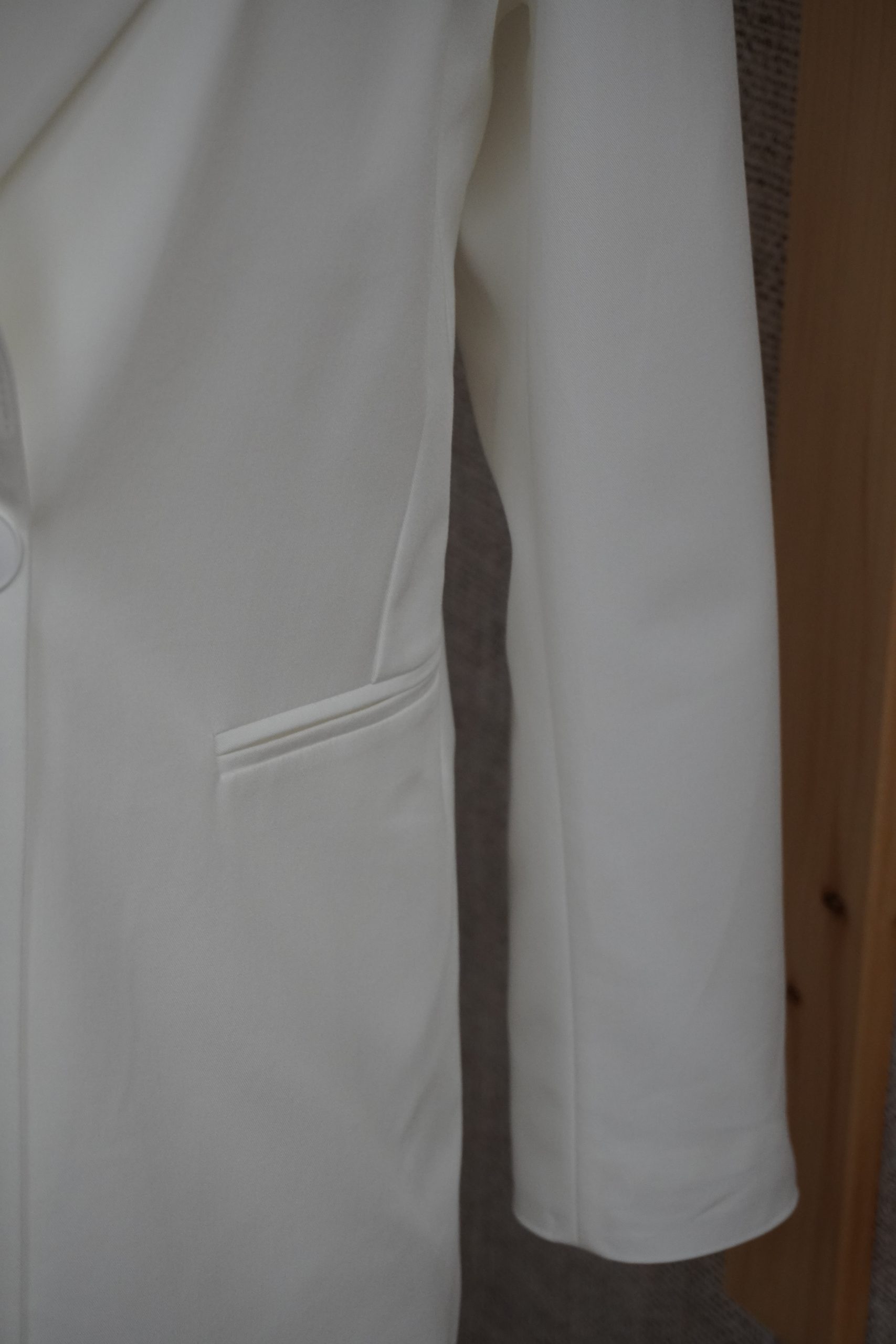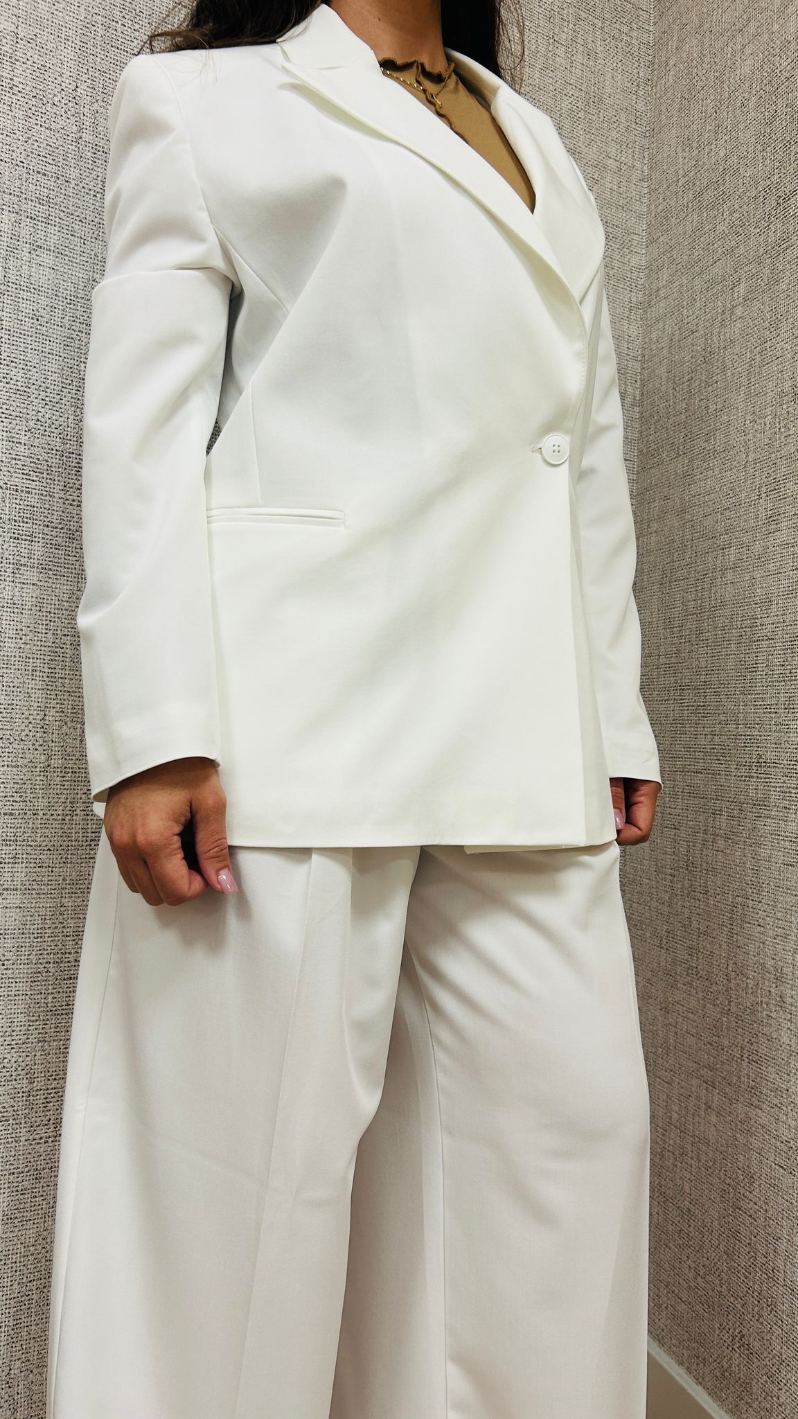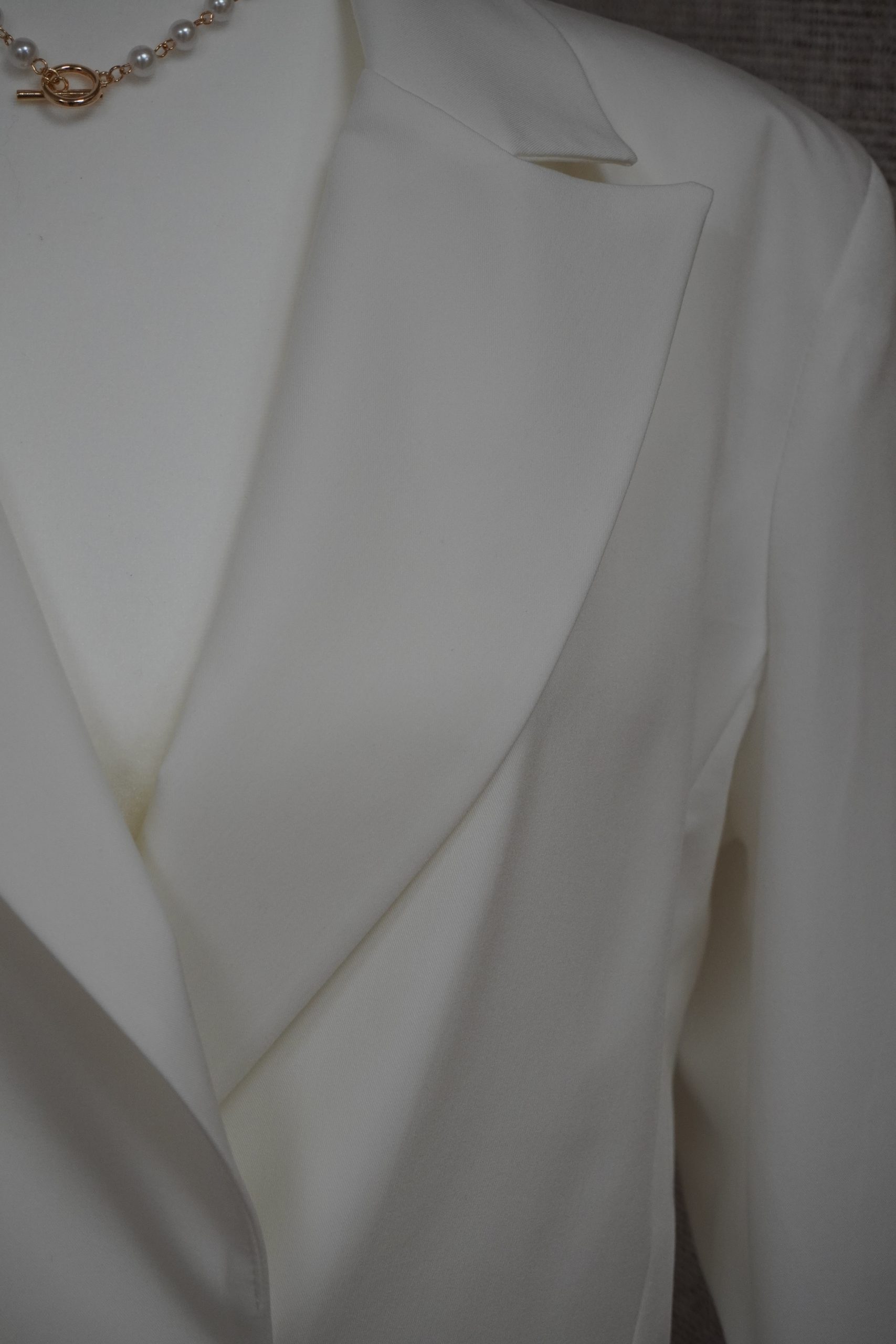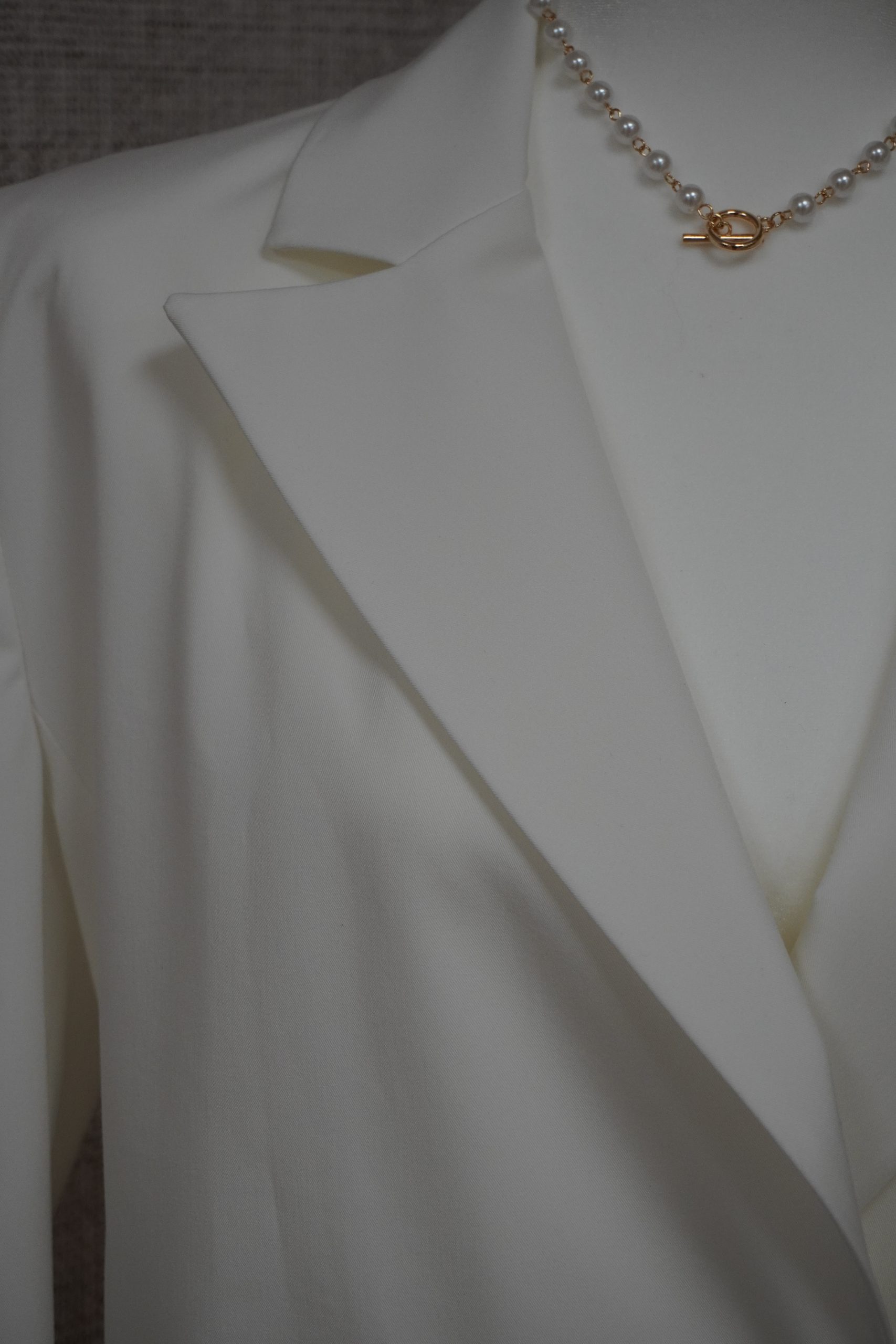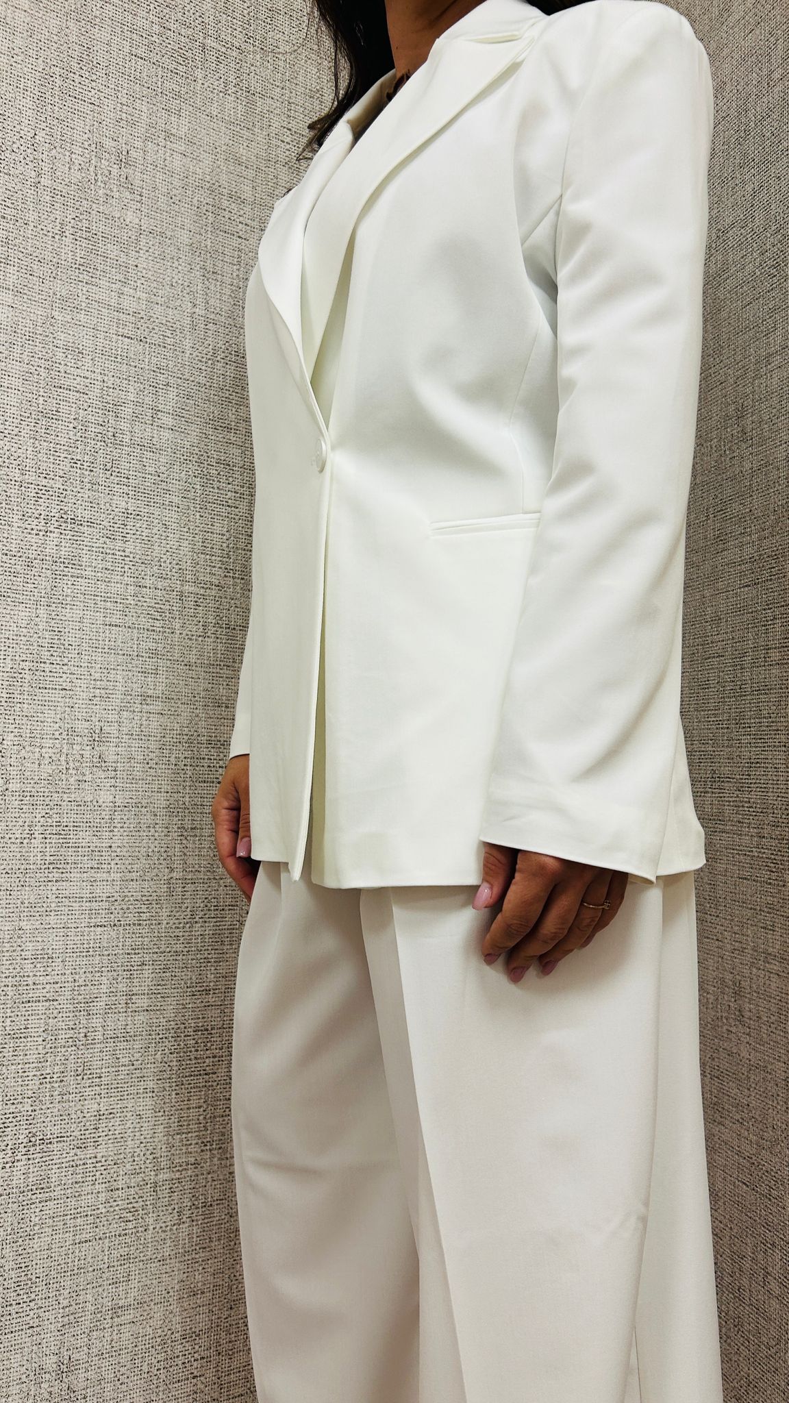 Este blazer blanco es la definición de sofisticación y versatilidad. Confeccionado en una tela suave y de excelente caída, presenta un corte recto con solapa clásica y cierre frontal con un único botón que realza la silueta de manera sutil. Posee bolsillos discretos tipo ribete y un diseño limpio que lo convierte en una pieza clave tanto para looks formales como casual chic.