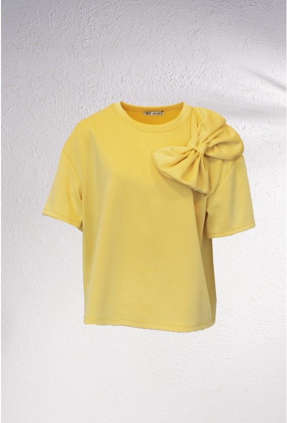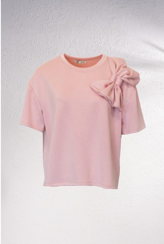 Blusa con lazo frontal de corte recto y manga corta, confeccionada en un tejido suave de punto con una textura ligeramente estructurada. Su diseño minimalista se eleva gracias a un gran lazo decorativo colocado en el hombro izquierdo, que aporta un toque femenino y elegante sin perder la esencia contemporánea de la prenda.