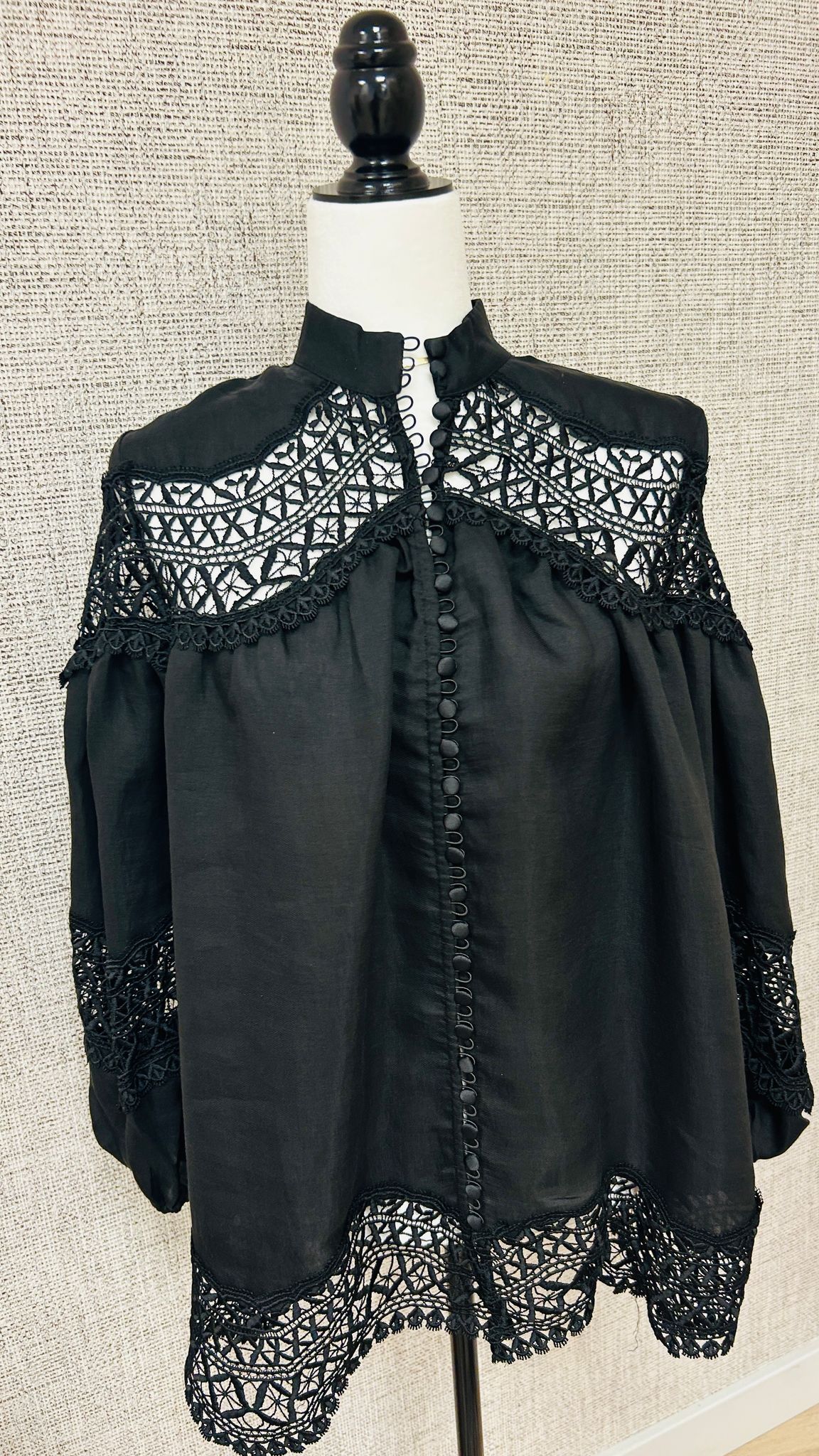 Blusa negra de estilo bohemio con espectaculares detalles de encaje calado en mangas, canesú y bajo. Confeccionada en un tejido ligero y fluido, destaca por su silueta amplia y mangas abullonadas que aportan volumen y personalidad. El cierre frontal con botones forrados y el cuello subido le añaden un toque vintage encantador. Ideal para combinar con jeans o pantalones sastre y elevar cualquier look con elegancia y estilo.