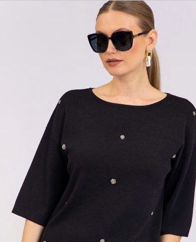 Esta blusa tiene un diseño sofisticado y minimalista en color negro. Su corte es recto y holgado, con mangas tres cuartos que le aportan un toque elegante y versátil. El detalle distintivo de la prenda son los pequeños apliques brillantes distribuidos sutilmente por toda la superficie, que agregan un aire refinado sin sobrecargar el diseño. Es una pieza ideal para combinar tanto con pantalones formales como con faldas, perfecta para un look chic y moderno.