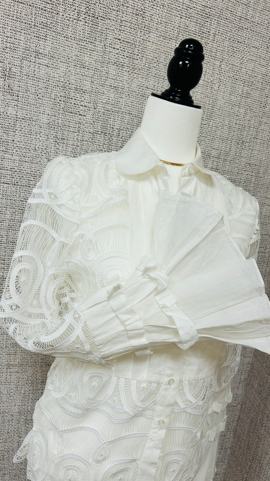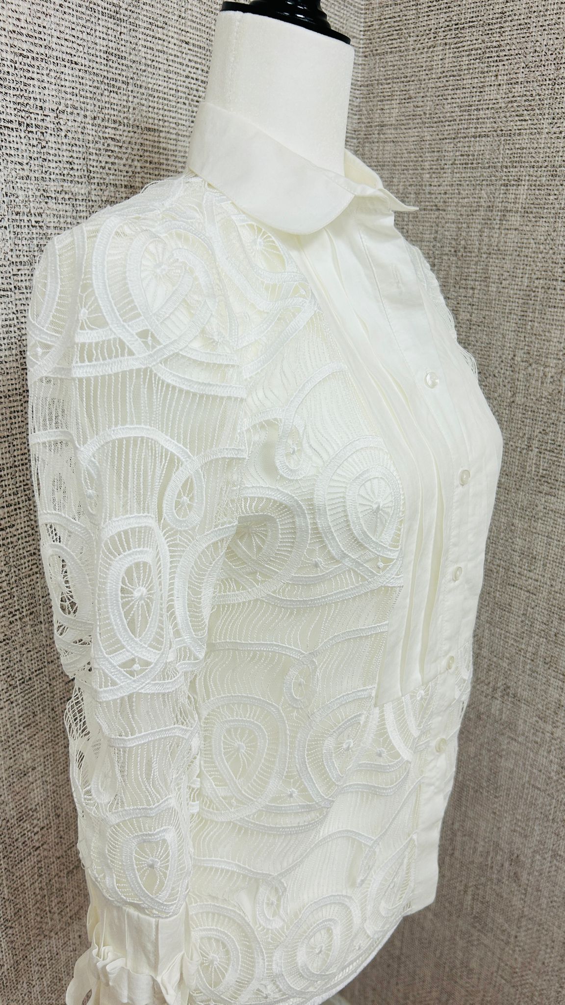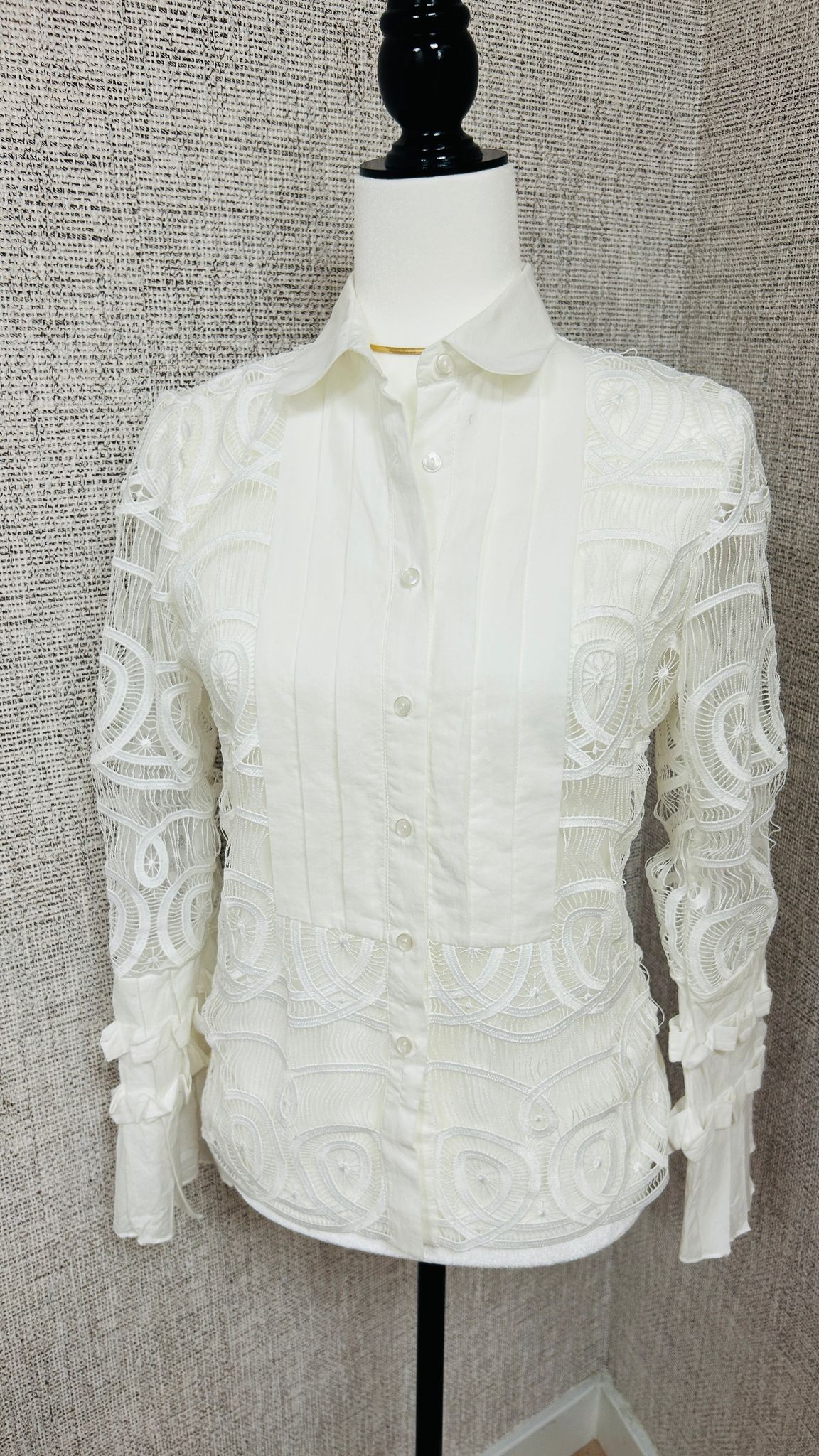 Blusa de estilo elegante y sofisticado, confeccionada en un tono blanco marfil. La tela presenta un bordado intrincado con formas ovaladas y curvas, lo que le da un aire romántico y artesanal. Las mangas y parte del torso están hechas de una malla semitransparente con estos detalles bordados. En la parte delantera hay una franja de tela opaca y plisada que cubre desde el cuello hasta el dobladillo, donde se encuentran los botones frontales. Las mangas terminan en puños anchos y plisados con lazos decorativos, lo que añade un toque femenino y de alta costura. Cuello clásico y estructurado, aportando formalidad al diseño. Se nota que está pensada para marcar la silueta, con costuras que realzan la forma del torso. Incluye una camiseta interior básica blanca, que sirve para cubrir lo translúcido del encaje.