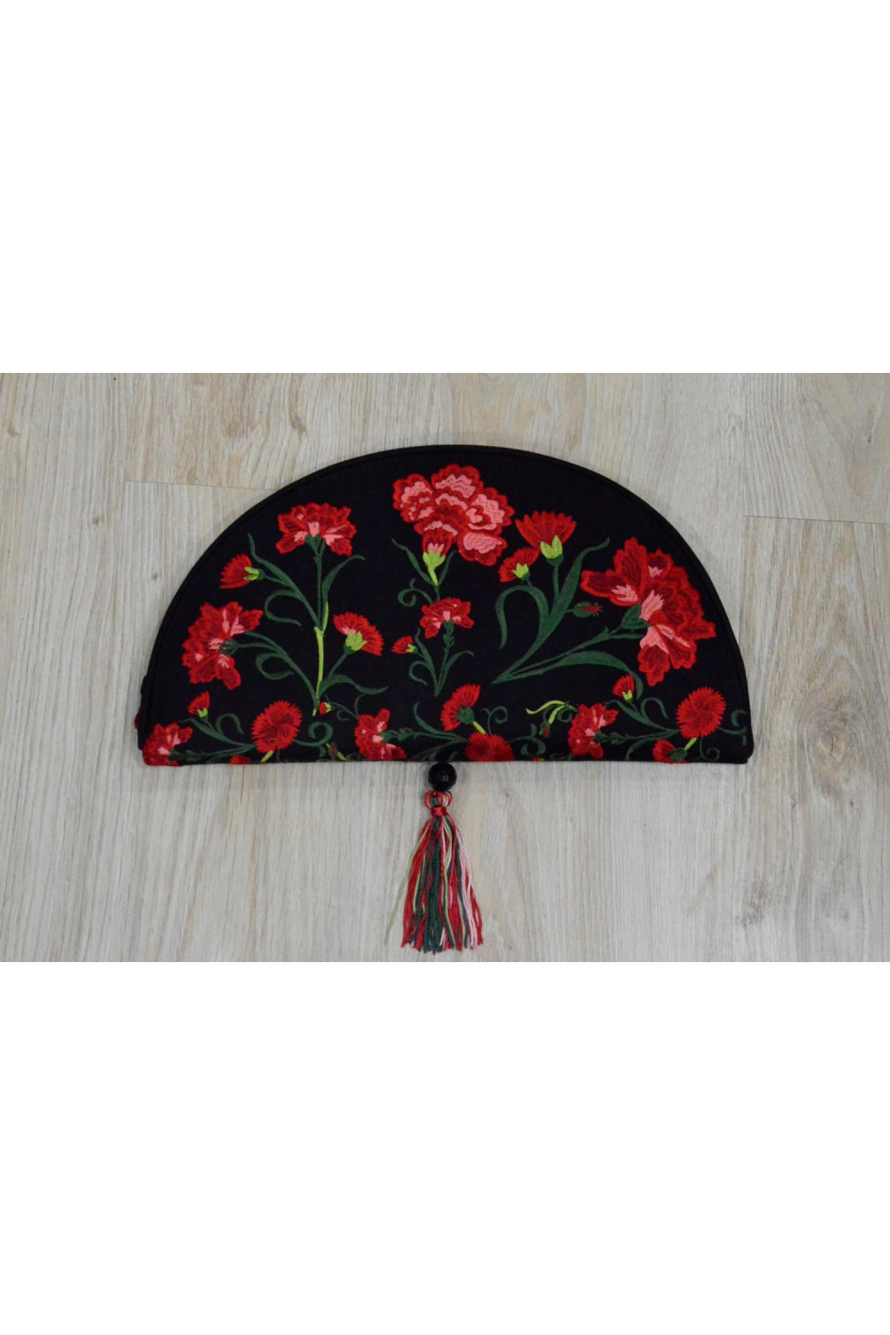 Bolso de mano negro bordado de claveles rojos con flecos multicolor. Calidad: 97% Algodón 3% Lycra – Forro:100% Poliéster – Flecos: 100% Viscosa