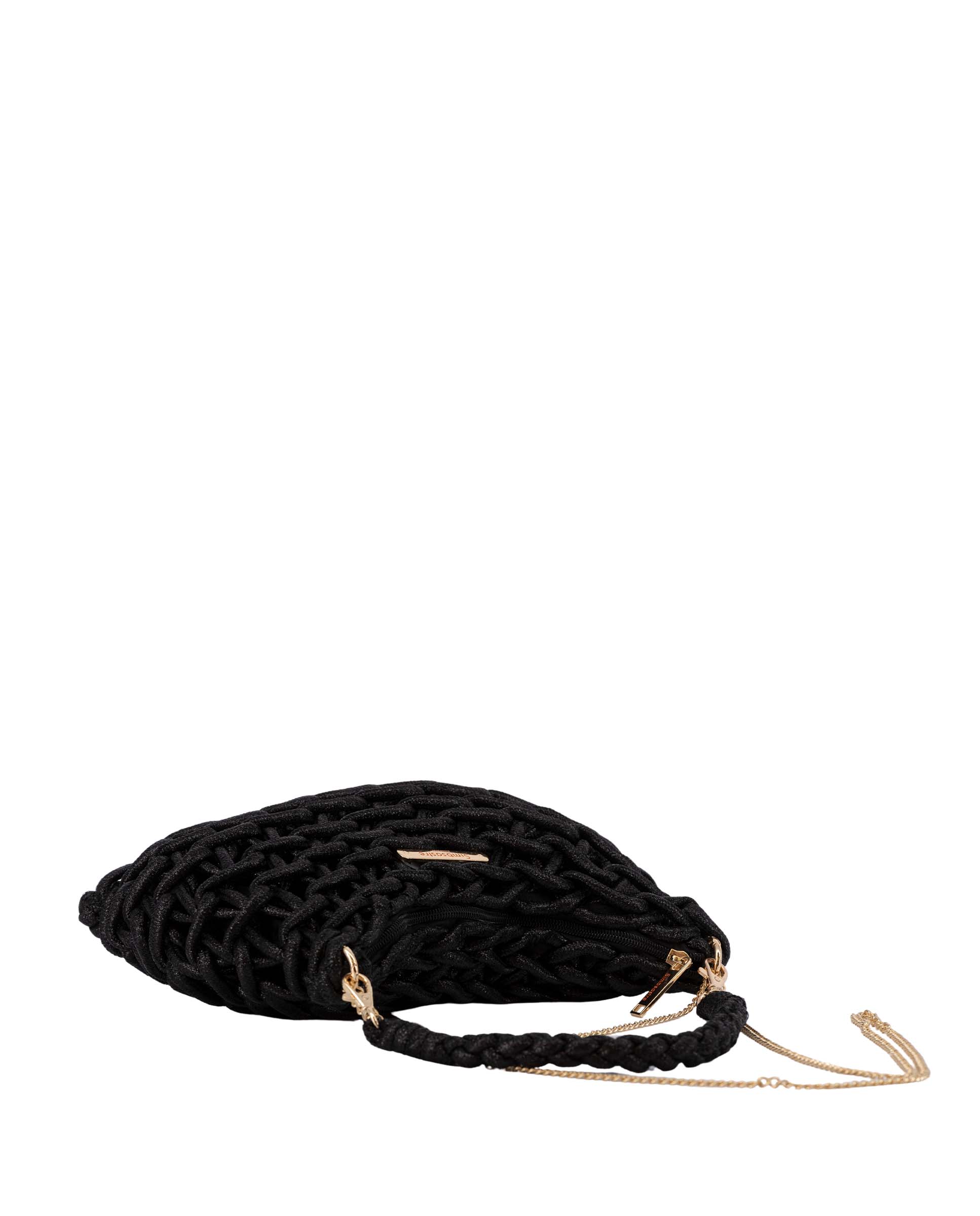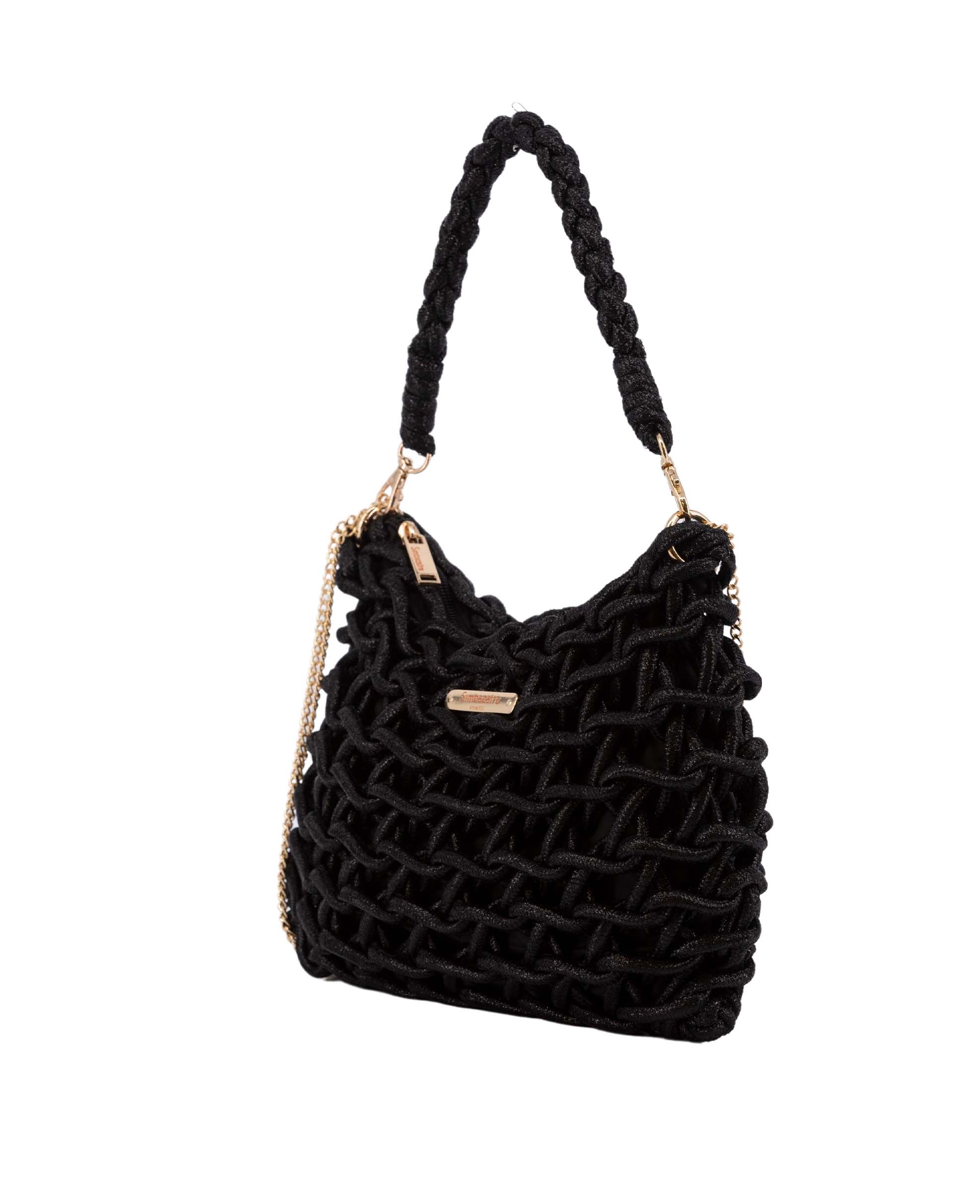 Bolso pequeño fabricado en cuerda de algodón y metal, con cierre cremallera y bolsillos interiores, asa cuerda metálica al tono y asa bandolera de cadena con logo en dorado