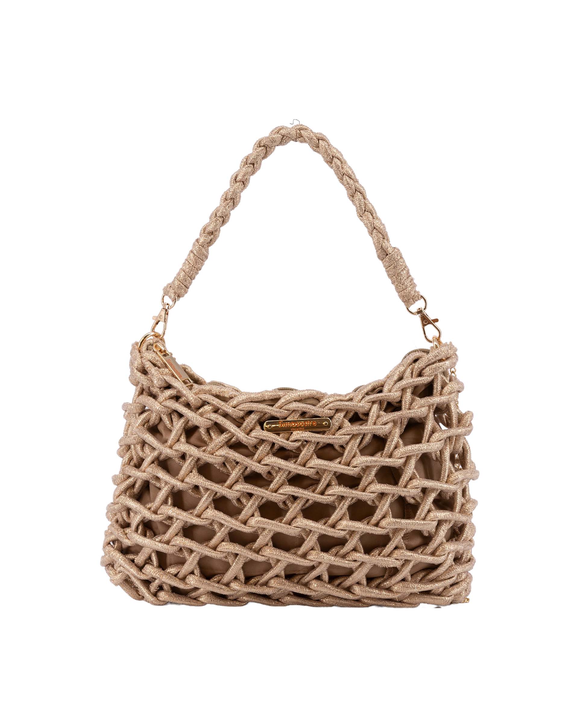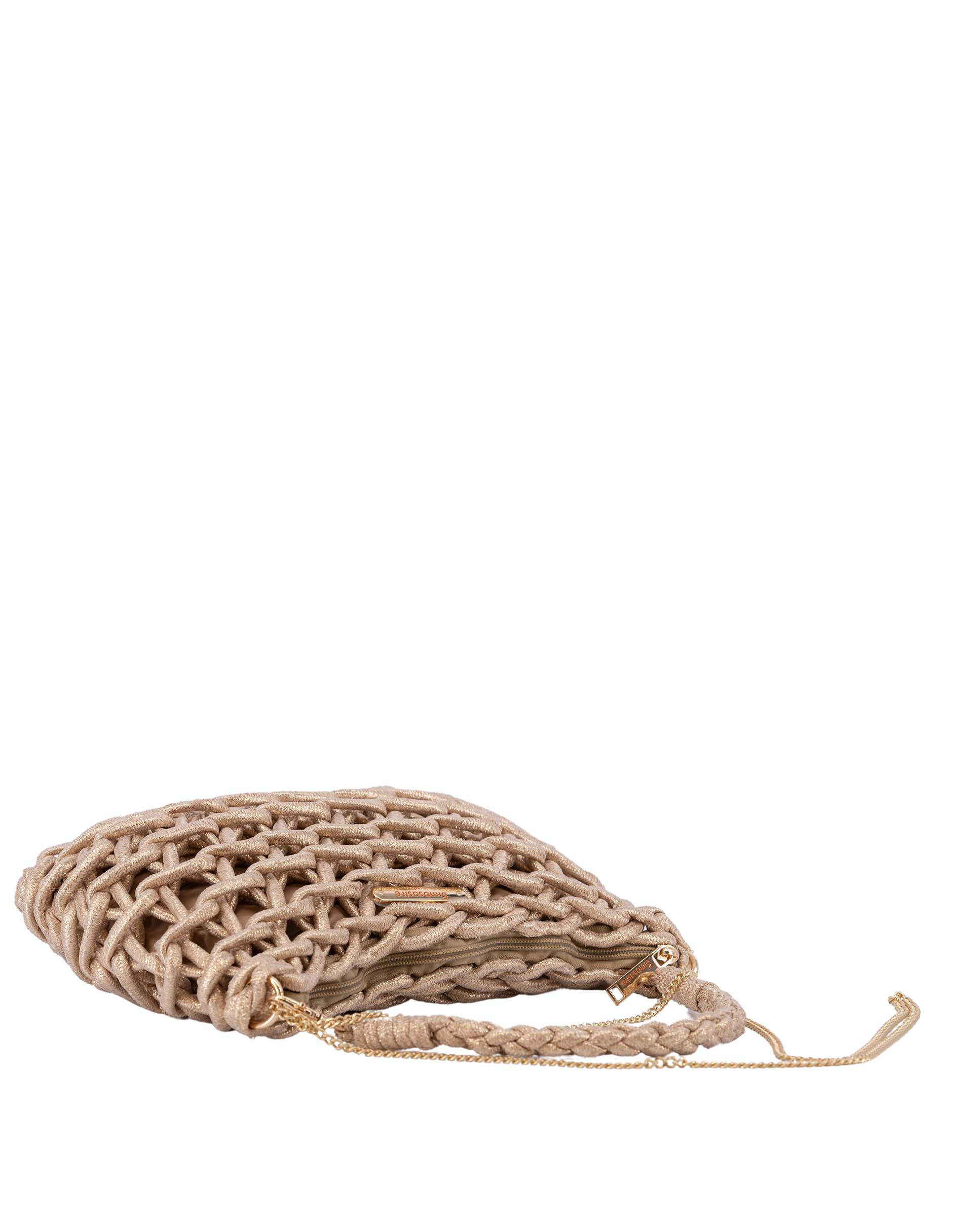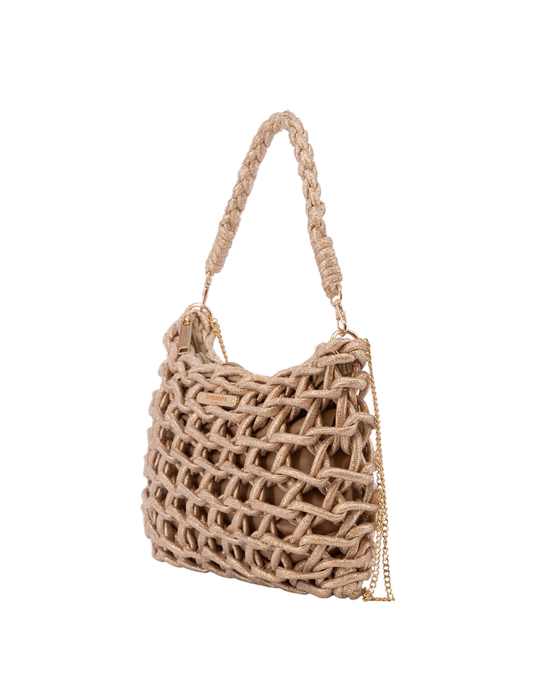 Bolso pequeño fabricado en cuerda de algodón y metal, con cierre cremallera y bolsillos interiores, asa cuerda metálica al tono y asa bandolera de cadena con logo en dorado