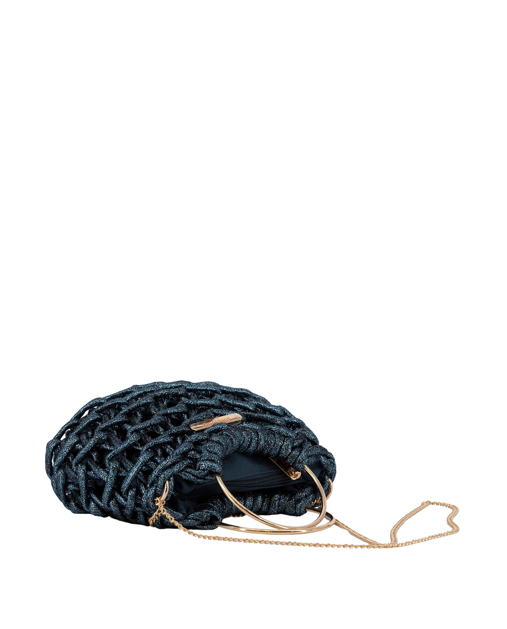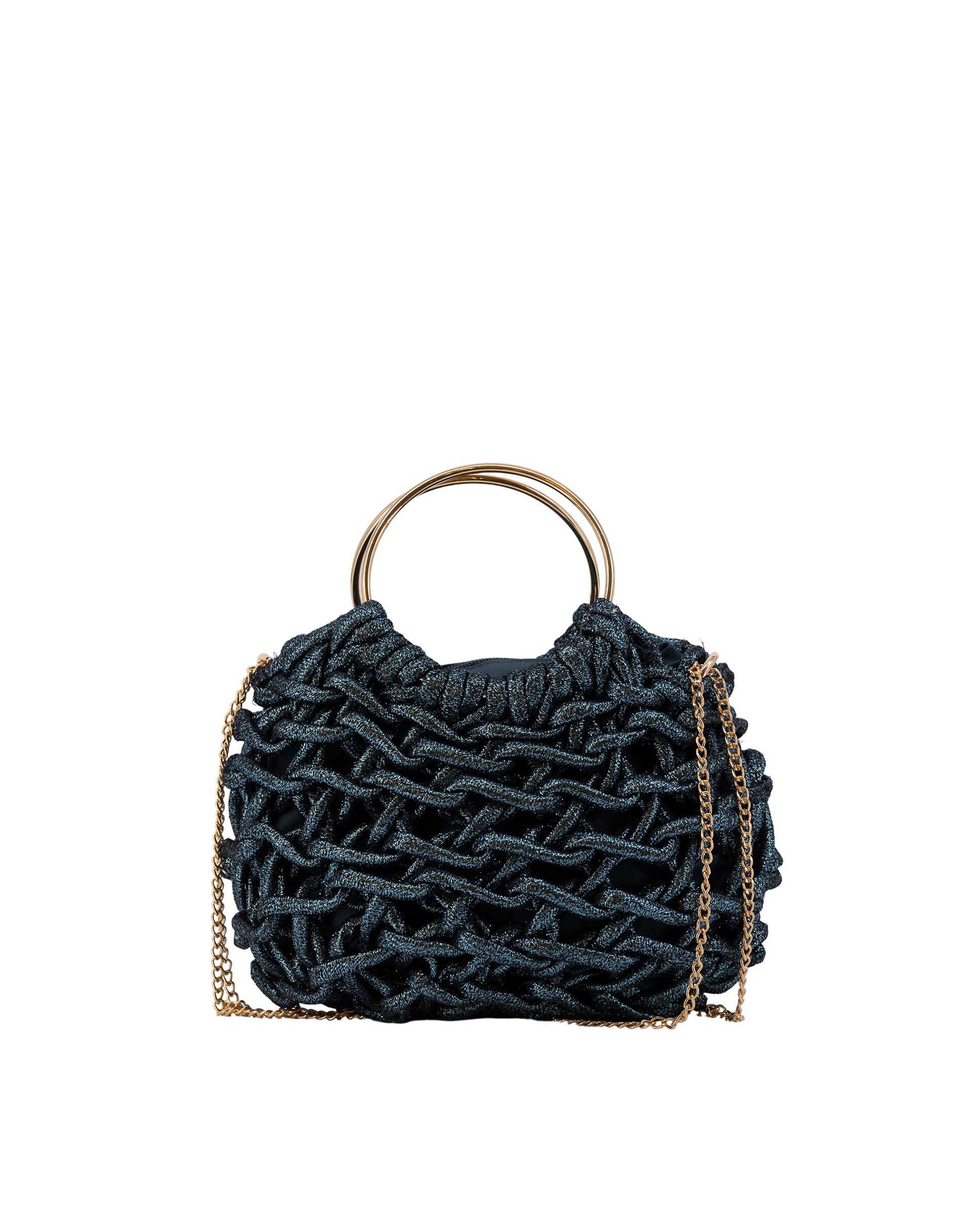 Bolso mini fabricado en cuerda de algodón y metal, con cierre cremallera y bolsillo interior, asa estilo pita en metal dorado y asa bandolera de cadena en dorado, logo de metal