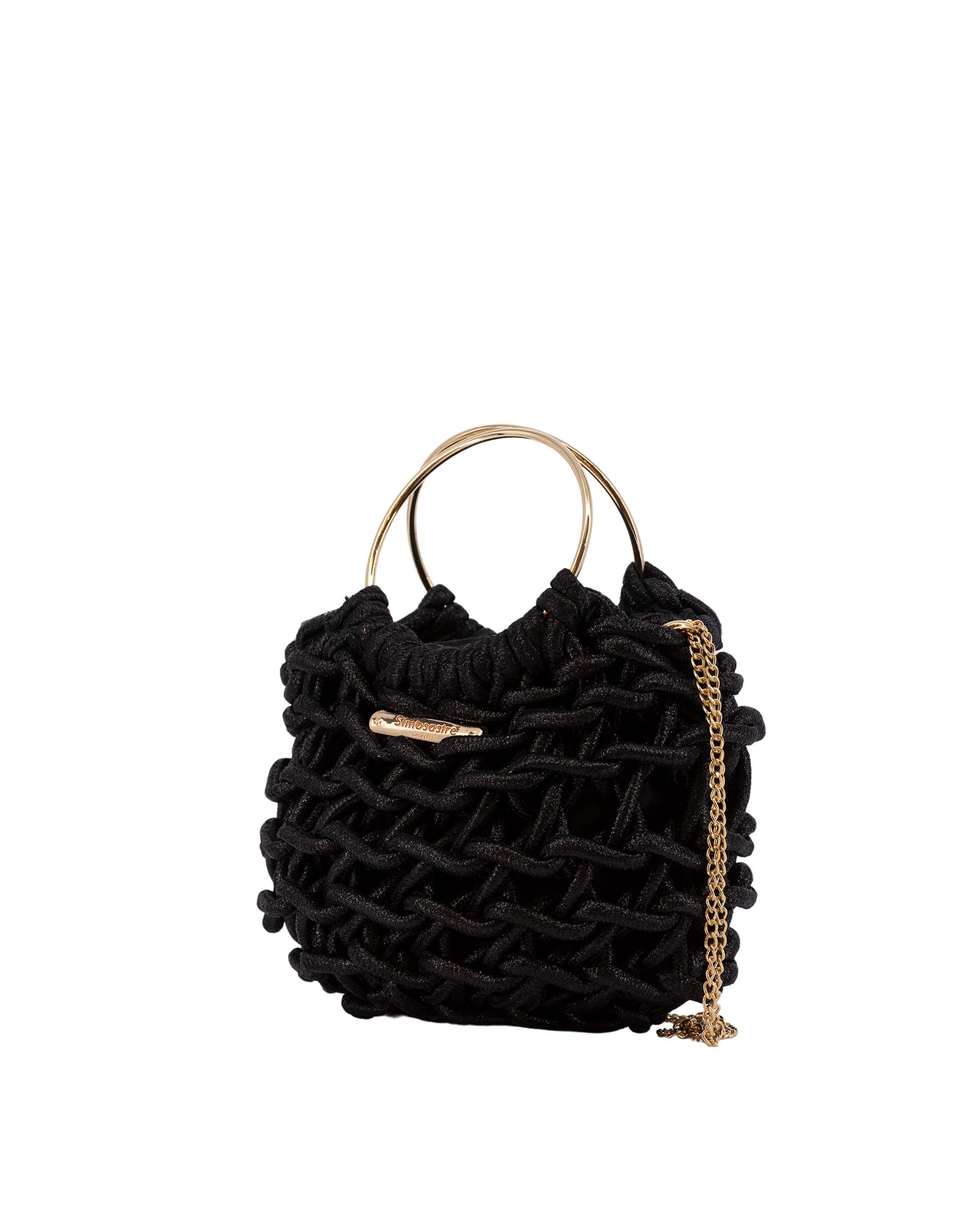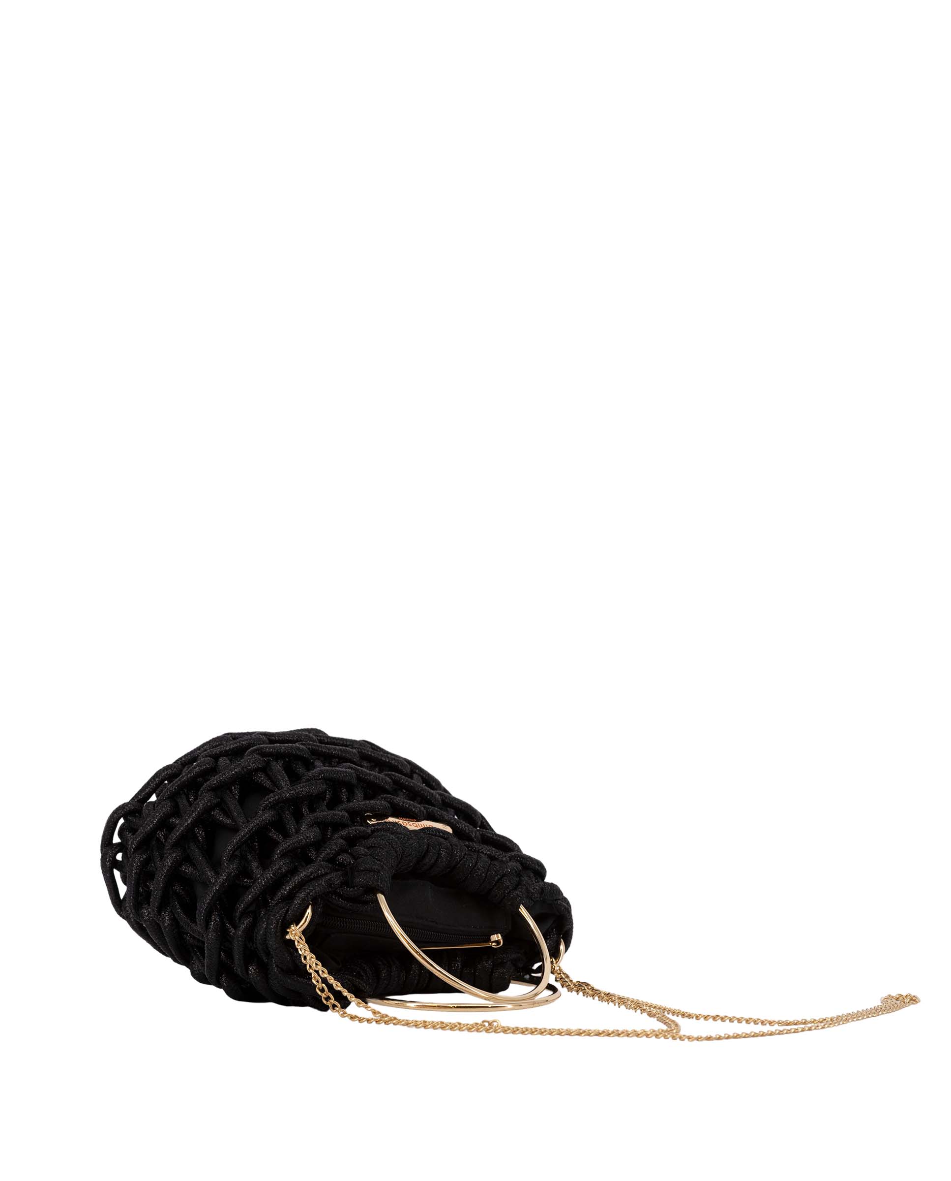 Bolso mini fabricado en cuerda de algodón y metal, con cierre cremallera y bolsillo interior, asa estilo pita en metal dorado y asa bandolera de cadena en dorado, logo de metal