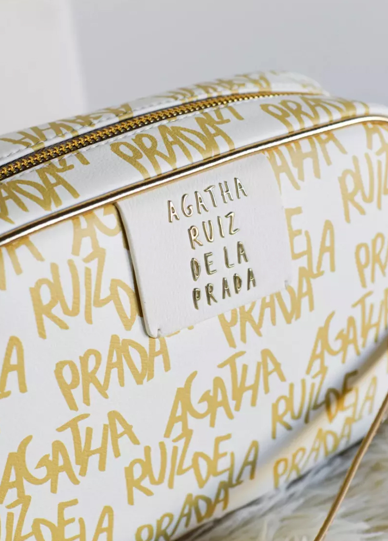 Bolso pequeño fabricado en algodón con hilos metalizados, con diseño estilo crochet y cierre tipo saco, bolsillos interiores, asa estilo bandolera en el mismo material y logo dorado.