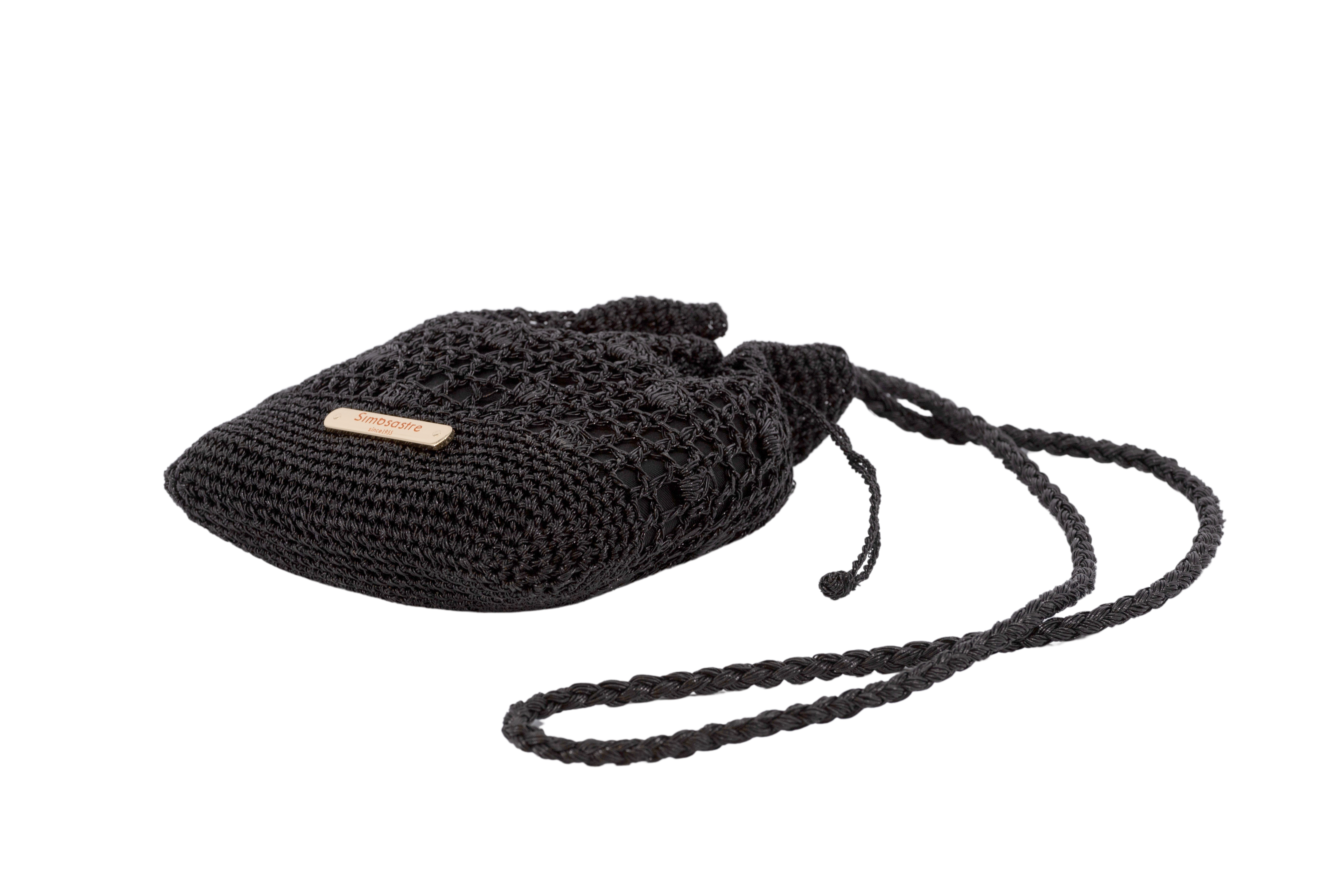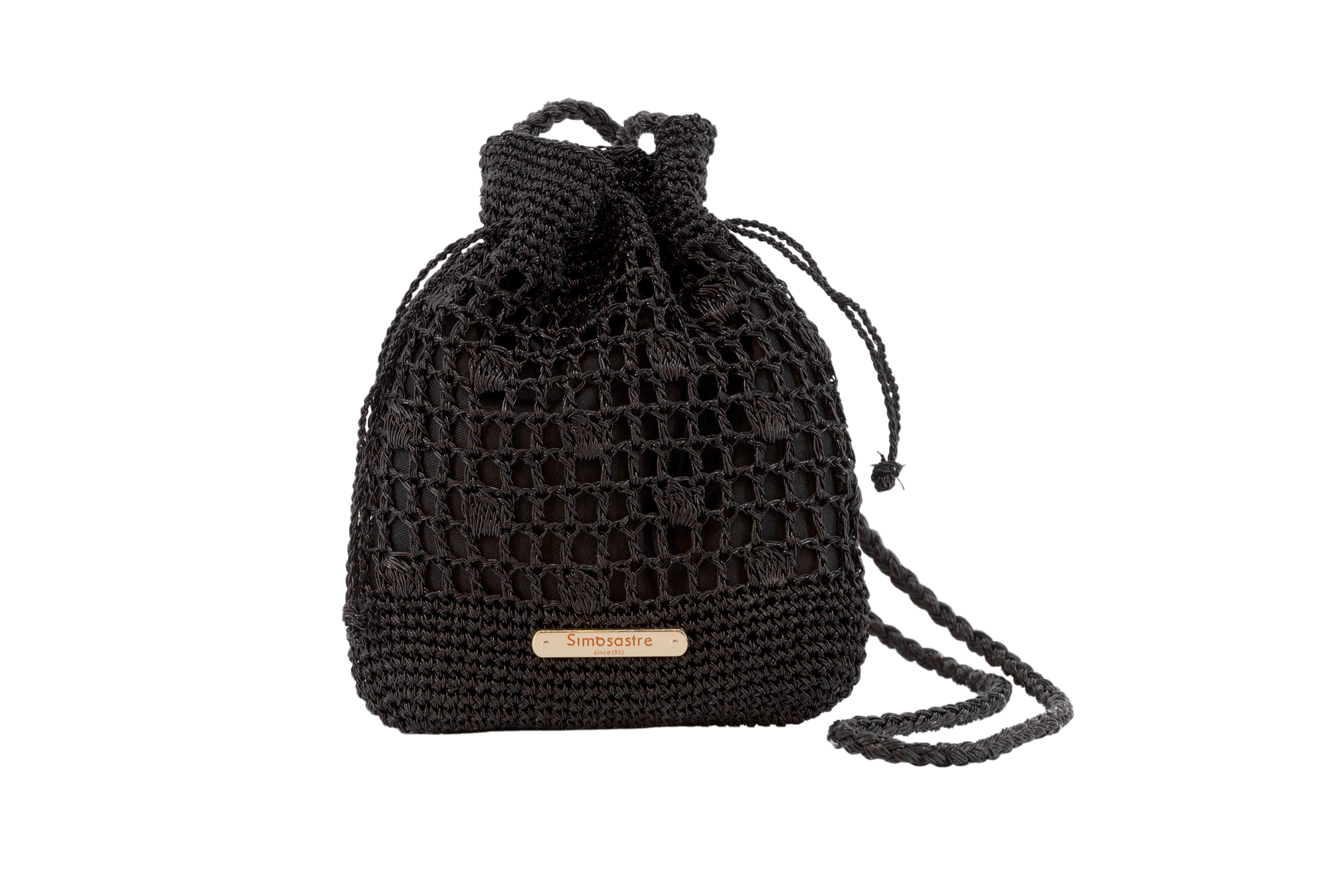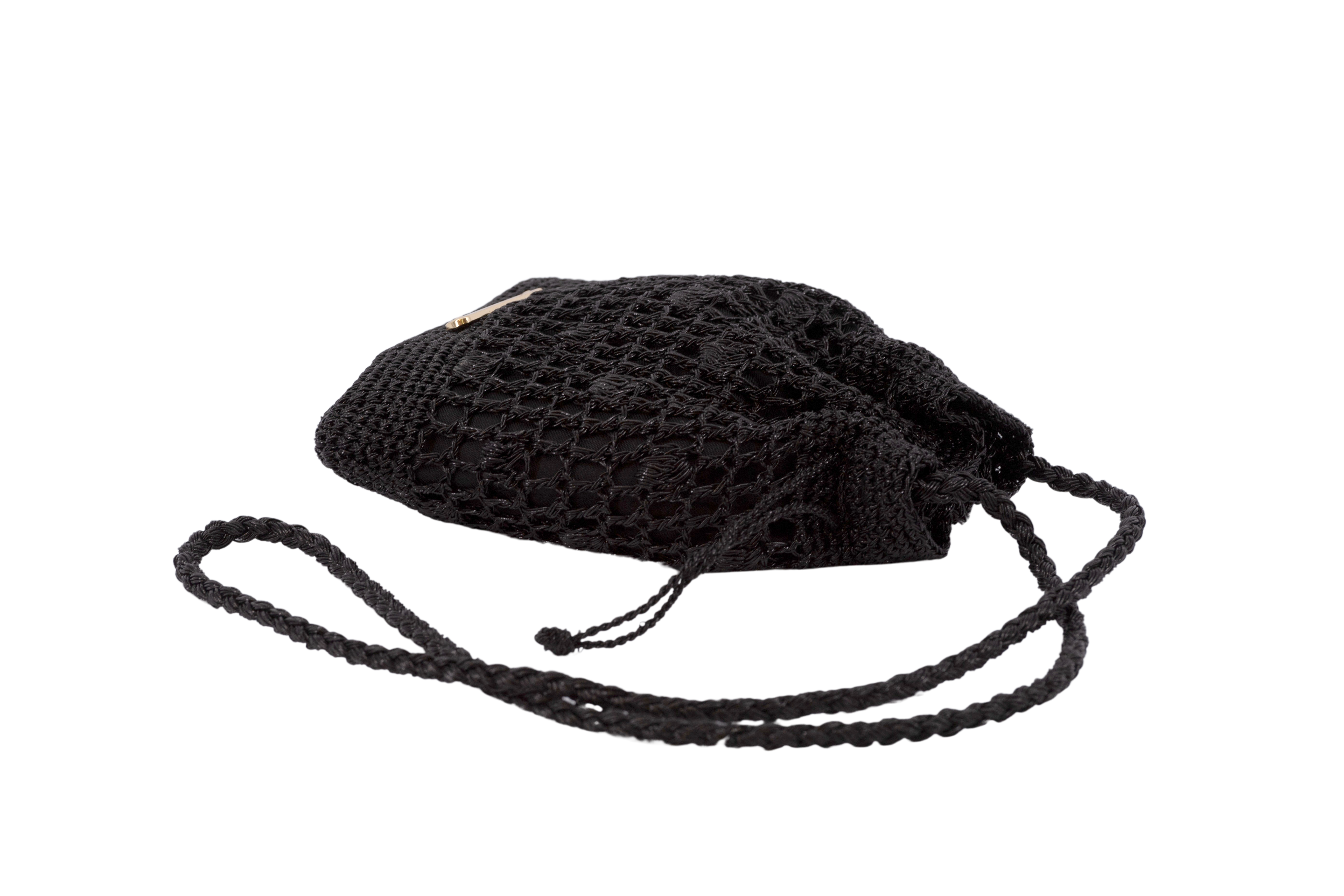 Bolso pequeño fabricado en algodón con hilos metalizados, con diseño estilo crochet y cierre tipo saco, bolsillos interiores, asa estilo bandolera en el mismo material y logo