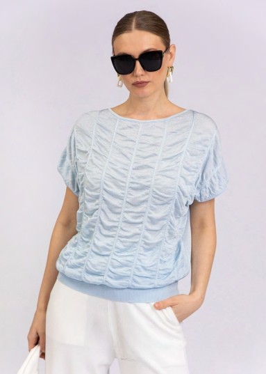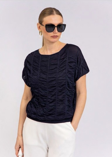 Top de manga corta con un diseño texturizado en la tela, que presenta un patrón de líneas verticales onduladas. Tiene un corte holgado con un ajuste más ceñido en la cintura gracias a su banda elástica en la parte inferior.