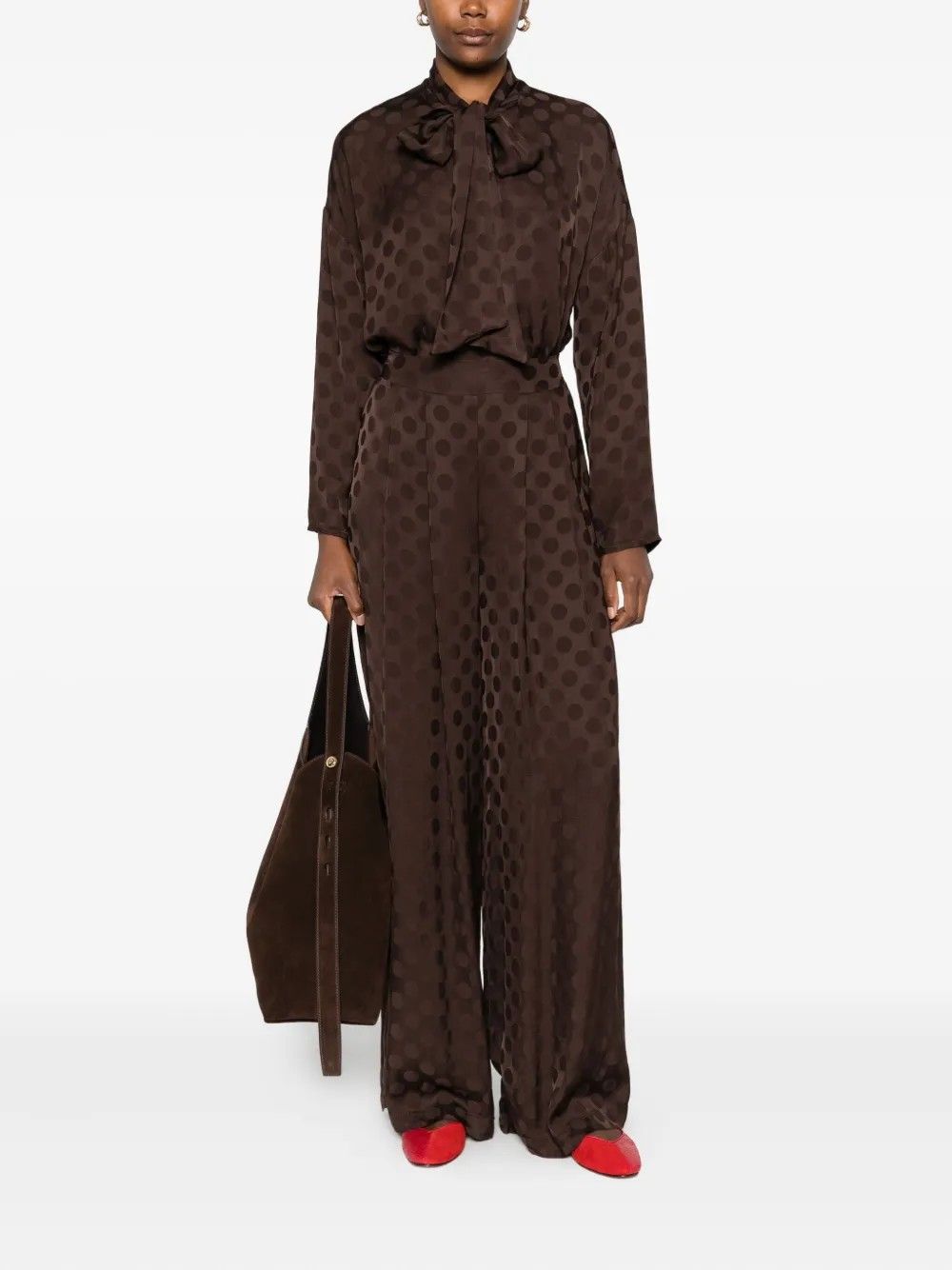 Esta es una blusa de manga larga en color morado oscuro con un elegante estampado de lunares tono sobre tono que le da textura y discreto contraste. Su diseño destaca por el cuello con lazo largo que puede anudarse o dejarse suelto, aportando versatilidad al estilo. De corte suelto y fluido, ofrece comodidad sin perder sofisticación, mientras que el dobladillo irregular añade un toque moderno y desenfadado. Es una prenda ideal para lucir en ocasiones formales combinada con pantalón o falda de vestir, aunque también puede integrarse en un look más casual al llevarla con jea