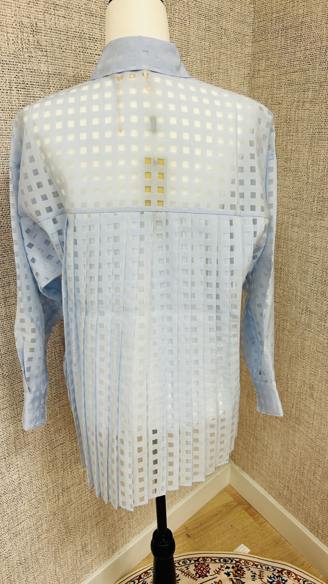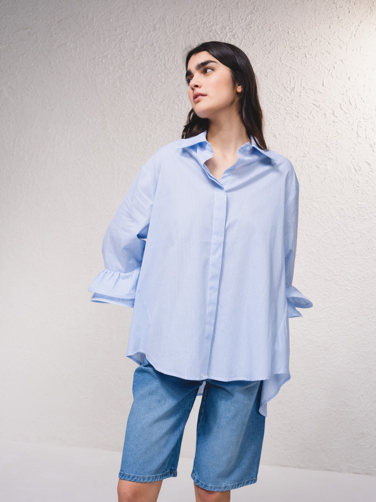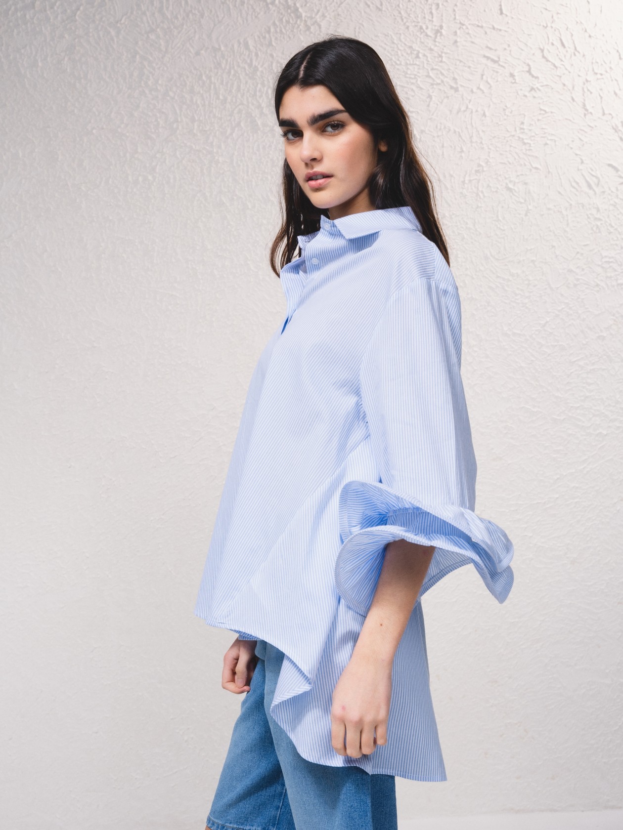 Camisa de estilo oversize, de corte amplio y suelto, confeccionada en un tejido ligero de rayas muy finas en azul claro y blanco. Tiene un diseño asimétrico en el dobladillo, siendo más larga en la parte trasera que en la delantera, lo que aporta un aire moderno y relajado.
