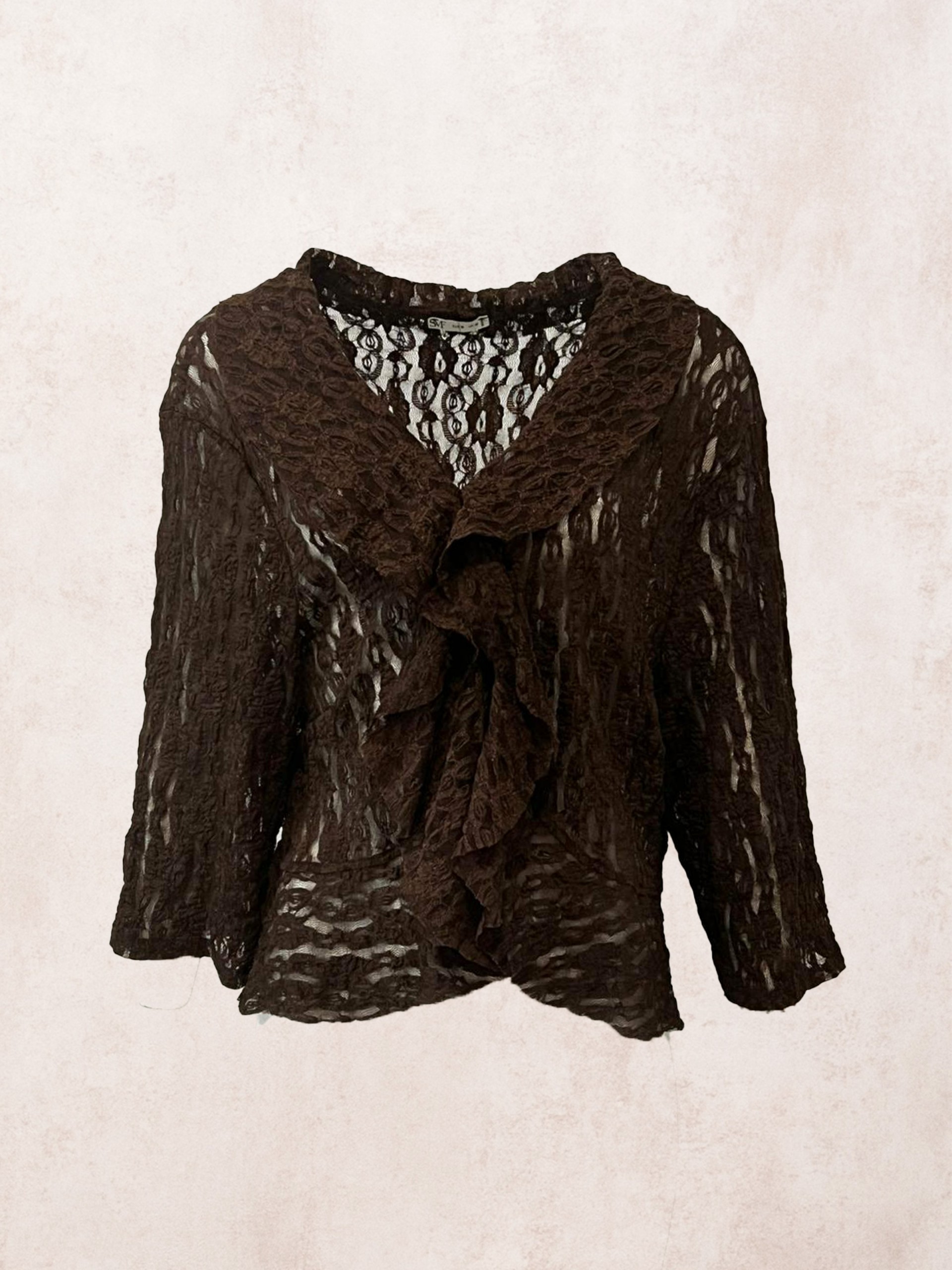La prenda de la imagen es una blusa de encaje en color marrón oscuro con un estilo elegante y romántico.