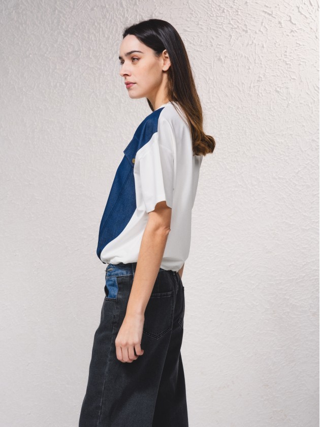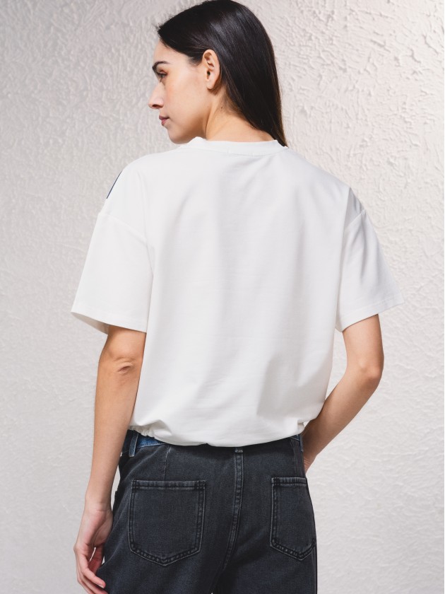 Camiseta corta oversize con elástico en el bajo, manga corta y cuello redondo, raya en contraste en la parte delantera con bolsillo decorativo.