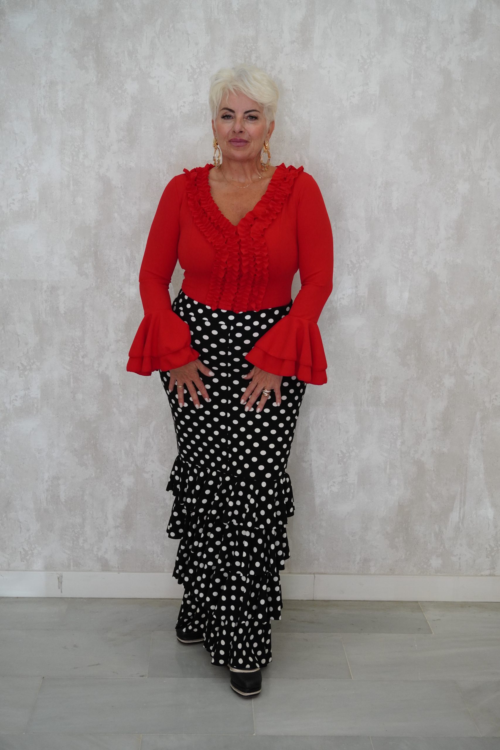 Esta blusa roja es una prenda vibrante y sofisticada que destaca por su diseño lleno de carácter. Con un favorecedor escote en «V» adornado con volantes, aporta un toque femenino y elegante, ideal para realzar cualquier look. Las mangas largas con puños acampanados en capas le dan un aire flamenco y festivo, perfecto para quienes buscan un estilo con personalidad.