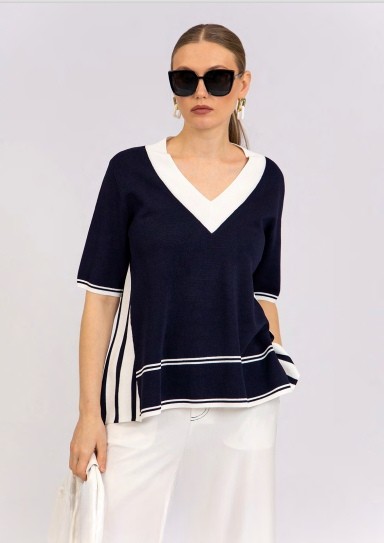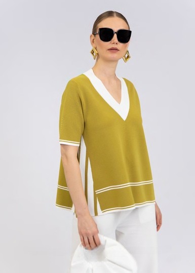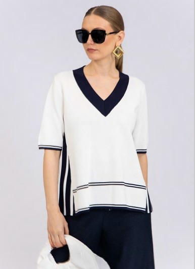 Estos jerseys presentan un diseño elegante y moderno con un corte amplio y ligero. Tienen un escote en V profundo con un ribete en contraste, lo que les da un toque sofisticado y favorecedor. Las mangas son de longitud media y el diseño incorpora detalles de líneas sutiles en la parte inferior y los costados, lo que aporta dinamismo y fluidez a la prenda.
