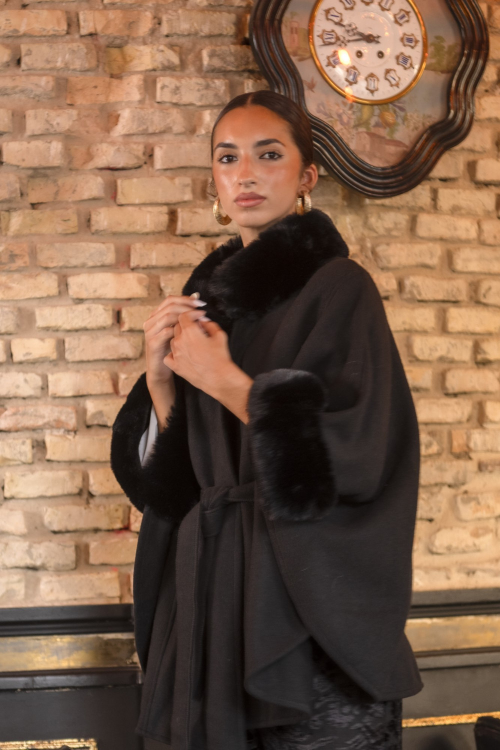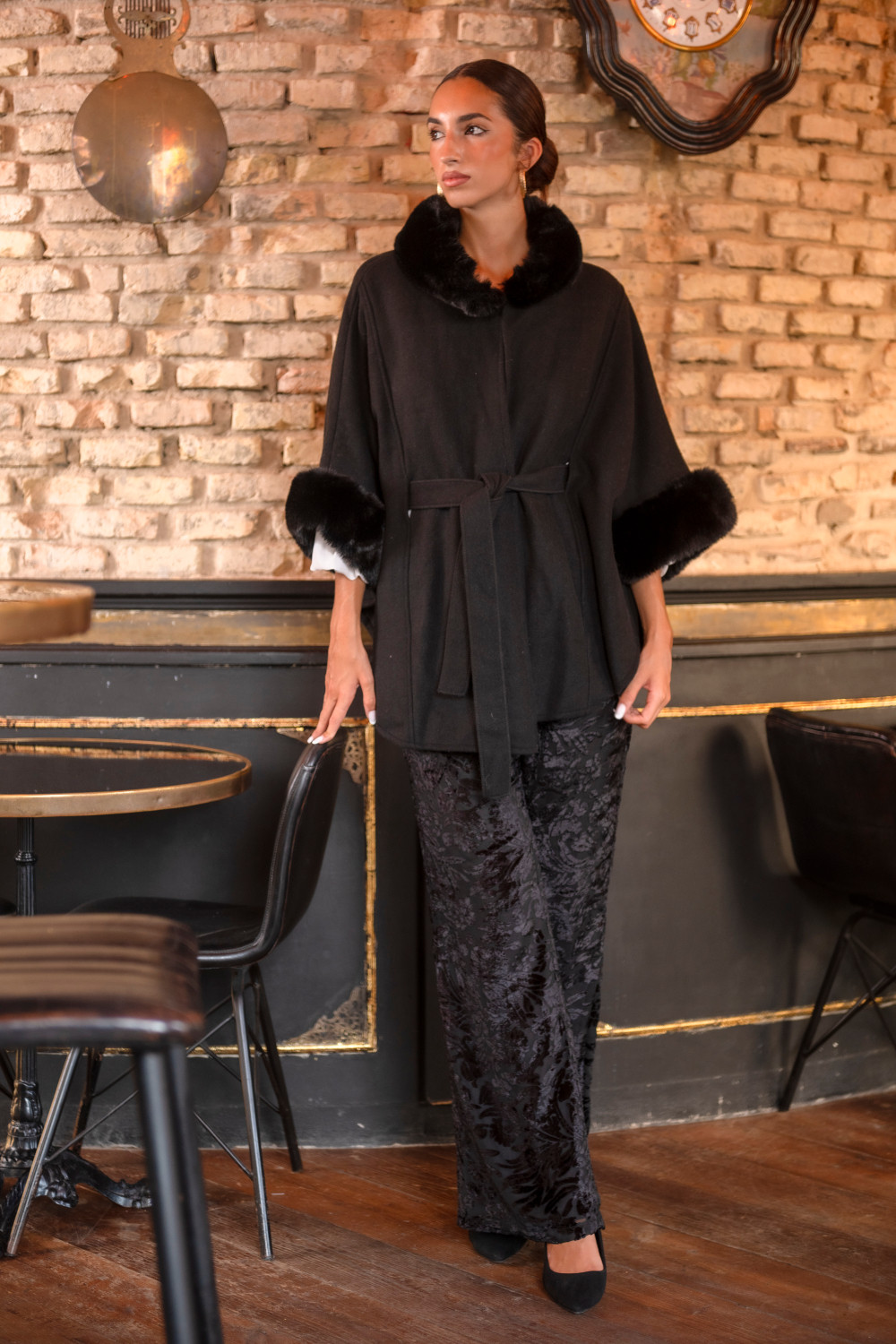 La prenda es una capa amplia de corte elegante, con un diseño suelto que se ajusta en la cintura mediante un cinturón del mismo material. Presenta un acabado sofisticado con un cuello voluminoso y suave, además de puños decorados que aportan un aire lujoso y refinado. Su caída fluida y estructurada le da un aspecto distinguido y atemporal, ideal para complementar un atuendo de noche o de ocasión especial. Es de talla única, lo que la hace versátil y adaptable a diferentes siluetas.