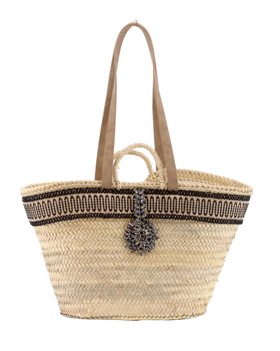 Capazo fabricado con palma, cremallera, dos asas de pita y dos asas de poli piel vegana estilo shopper,