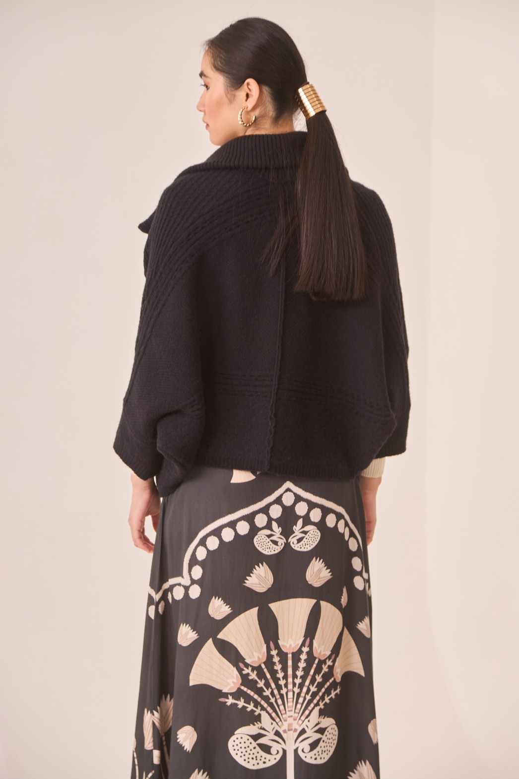 Este cardigan es una prenda elegante y acogedora, que combina un diseño sofisticado con un toque moderno. Su tejido grueso de punto en color negro le da una textura rica y envolvente, ideal para los días más frescos. El cardigan presenta un cuello alto, lo que aporta una sensación de abrigo adicional, mientras que su corte holgado y ligeramente estructurado en la parte posterior favorece una caída relajada y fluida. La pieza tiene un estilo abierto, sin botones, lo que permite usarla de forma casual o estilizarla sobre otros conjuntos. Los detalles de las mangas, con un acabado en punto acanalado, aportan un toque de dinamismo y suavidad. Esta prenda resulta perfecta para combinar con faldas o pantalones de talle alto, aportando tanto comodidad como sofisticación a cualquier look.