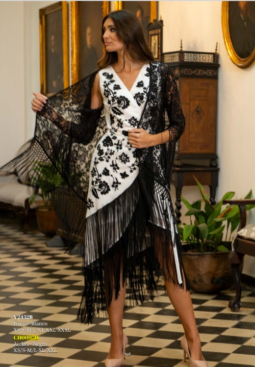 El chal es una prenda elegante de encaje negro con detalles florales y delicados flecos largos que le aportan un aire sofisticado y fluido.La estructura del chal es ligera y versátil, ideal para complementar atuendos formales o de inspiración flamenca. Los flecos añaden movimiento y un toque de dramatismo a la pieza, haciendo que luzca espectacular al caminar o moverse.