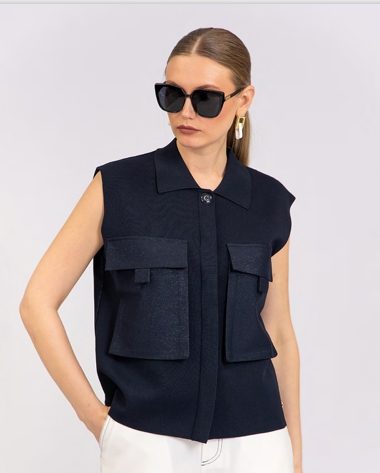 Chaleco corte recto y estructurado, brindando un estilo elegante y moderno, cuello camisero, aportando un toque sofisticado. Cierre frontal con botón y solapa, que disimula el cierre y mantiene una apariencia minimalista. Dos bolsillos grandes con solapa y solapín adicional en la parte frontal, dándole un aire utilitario y funcional.