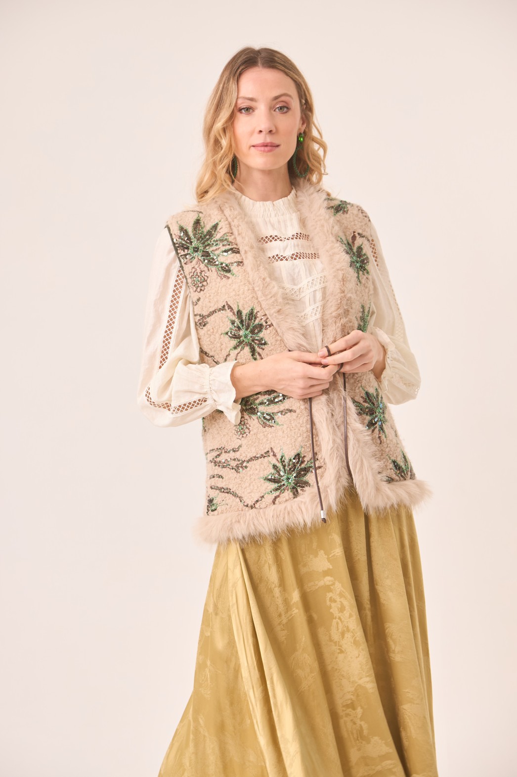 El chaleco es de corte corto y estilo bohemio, con un diseño que resalta por los bordados en tonos verdes, que parecen imitar hojas o elementos naturales. La prenda tiene una textura suave, con detalles de peluche en el contorno, lo que le otorga un aire acogedor y sofisticado. El tejido principal tiene un tono beige claro, y los bordados con brillantes añaden un toque de elegancia. Su cierre es discreto, pero ajustable, lo que le permite adaptarse cómodamente al cuerpo. Esta pieza es perfecta para darle un toque único y estilizado a un conjunto.