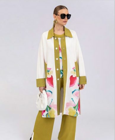 Cuello y puños en color verde oliva, generando un contraste moderno.