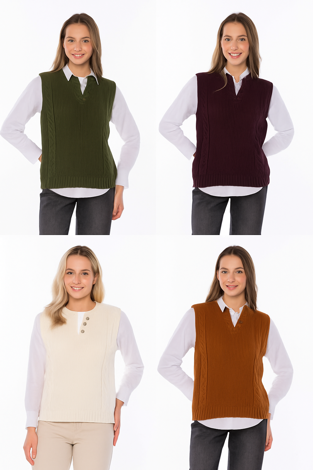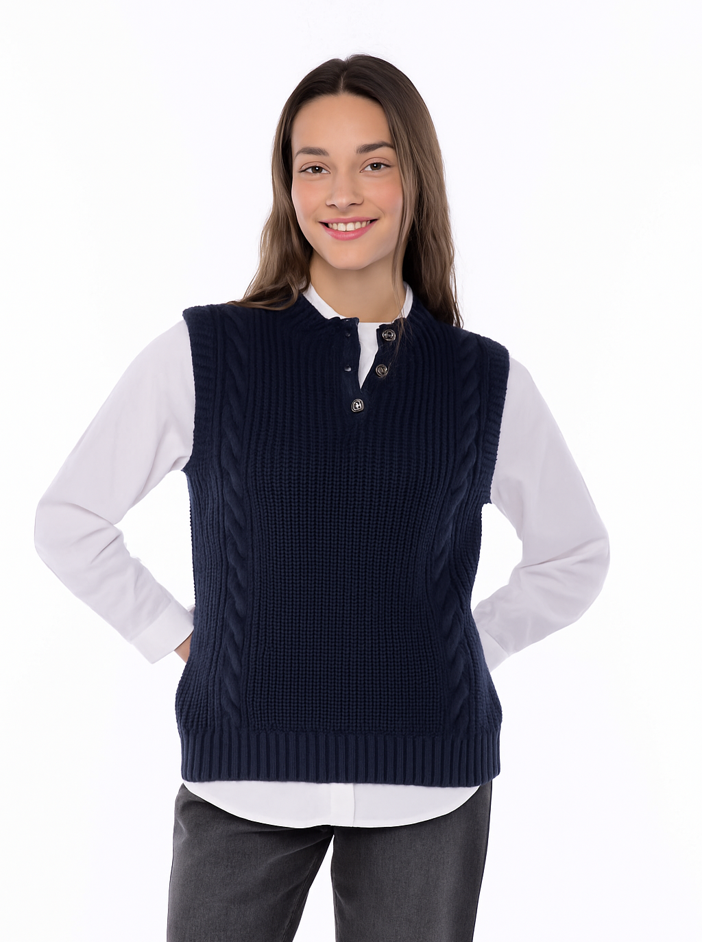 Este modelo es un chaleco de punto sin mangas, con diseño trenzado en los laterales y acabado acanalado en el bajo. Presenta un cuello en pico con tapeta de botones, lo que le aporta un detalle elegante y versátil. El corte es recto y favorecedor, ideal para llevar superpuesto sobre camisas o blusas, creando un look cómodo y sofisticado.