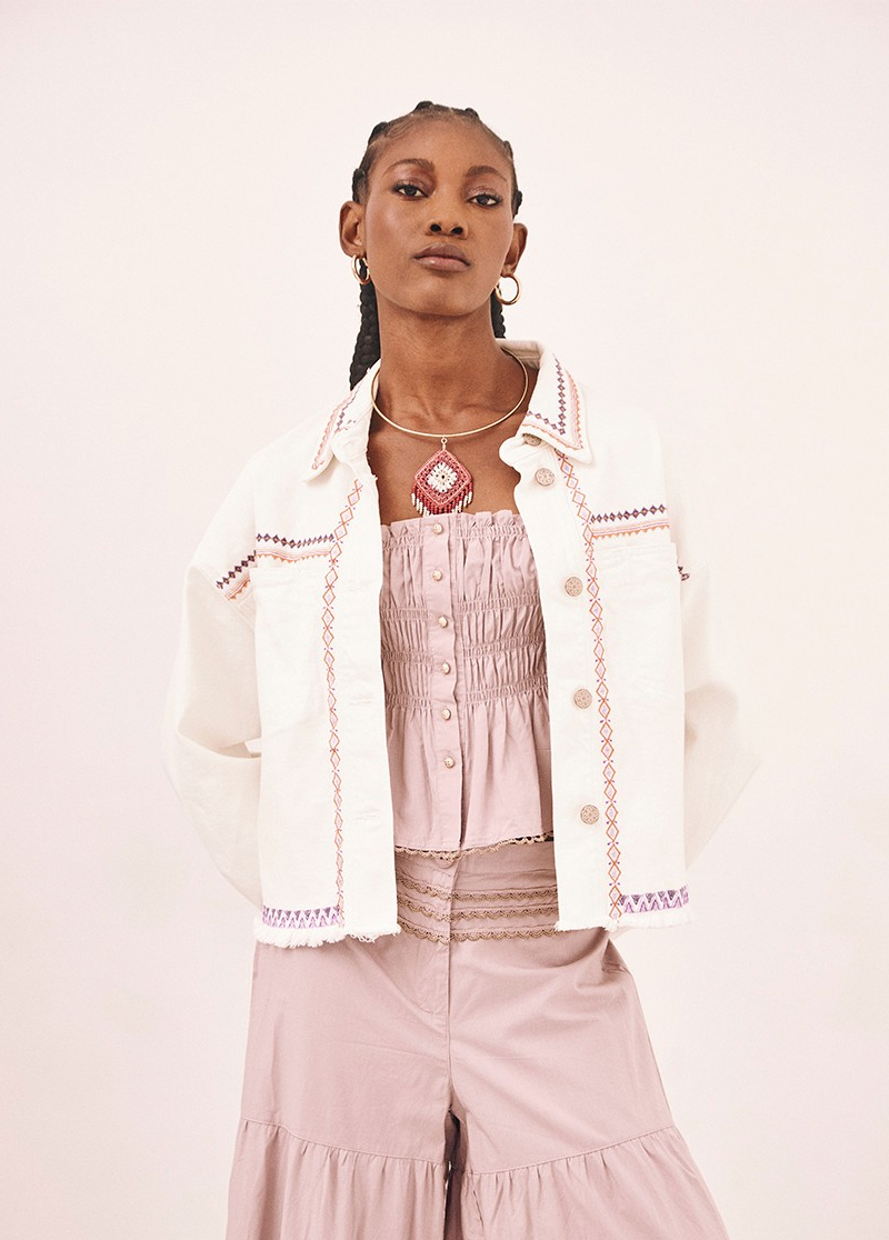 Chaqueta en tejido denim de manga larga, en tono liso con largo hasta la cadera. Detalles bordados étnicos multicolor. Botonadura metálica y cuello camisero.