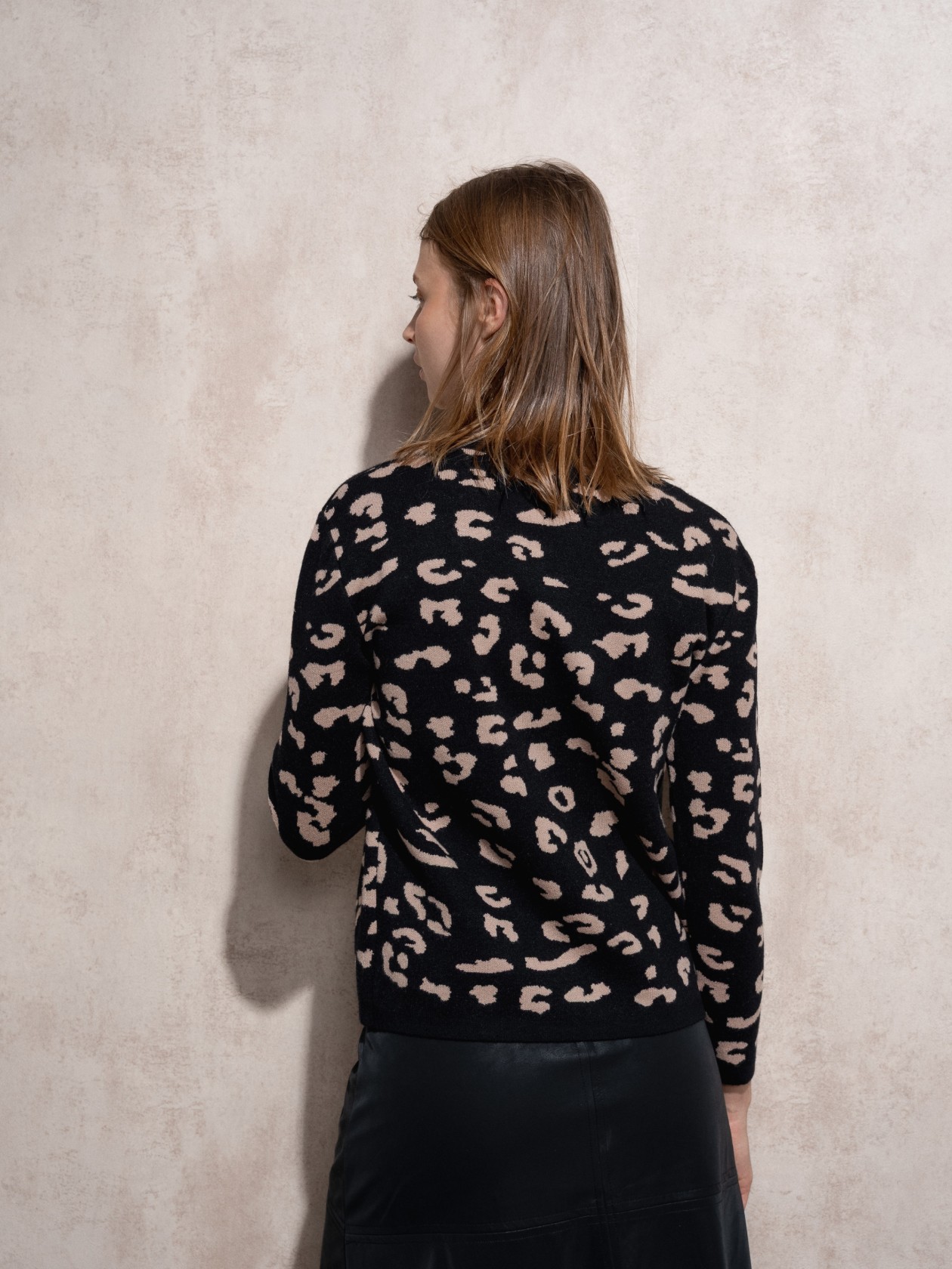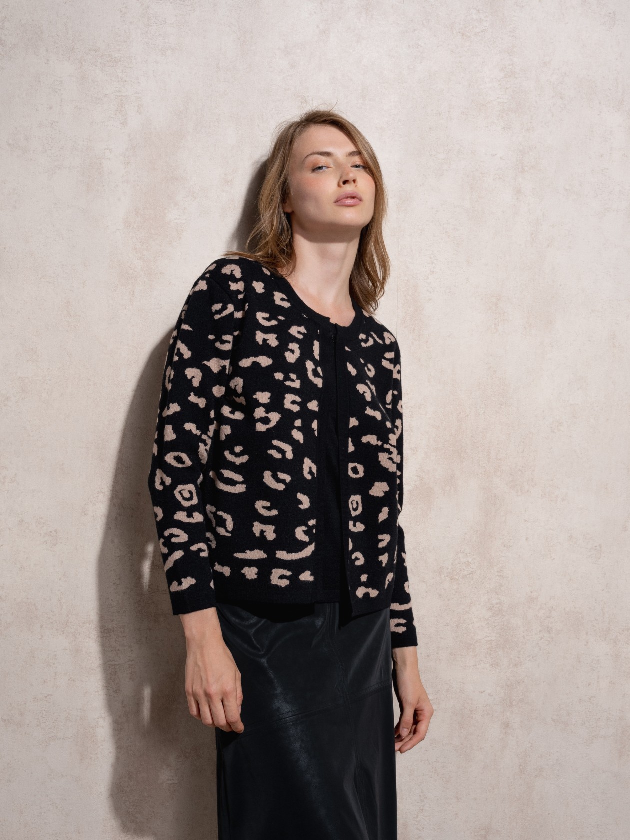 El conjunto de imágenes muestra un cárdigan de punto con estampado animal en versión abierta al frente y de manga larga. La prenda tiene un corte recto y clásico, con escote redondo y un cierre discreto en la parte superior que permite llevarlo tanto cerrado como abierto. El diseño de manchas distribuidas por toda la superficie le da un aire moderno y llamativo, mientras que el tejido de acabado suave aporta comodidad y facilidad de uso. Es una pieza versátil, ideal para combinar con básicos lisos o para dar un toque de personalidad a un look sencillo.