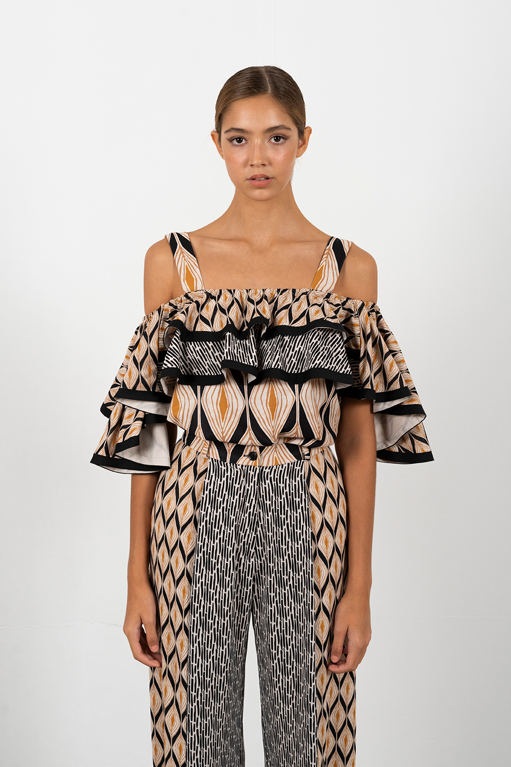 Eleva tu estilo con nuestro encantador top palabra de honor, una pieza que irradia frescura y sofisticación. Con un escote elástico que se adapta a tu figura y delicadas tirantas, este top es perfecto para resaltar tus hombros. Los dobles volantes viveados añaden movimiento al look.