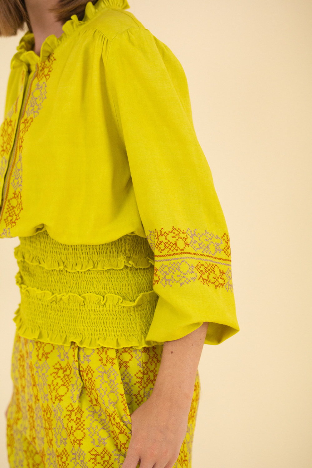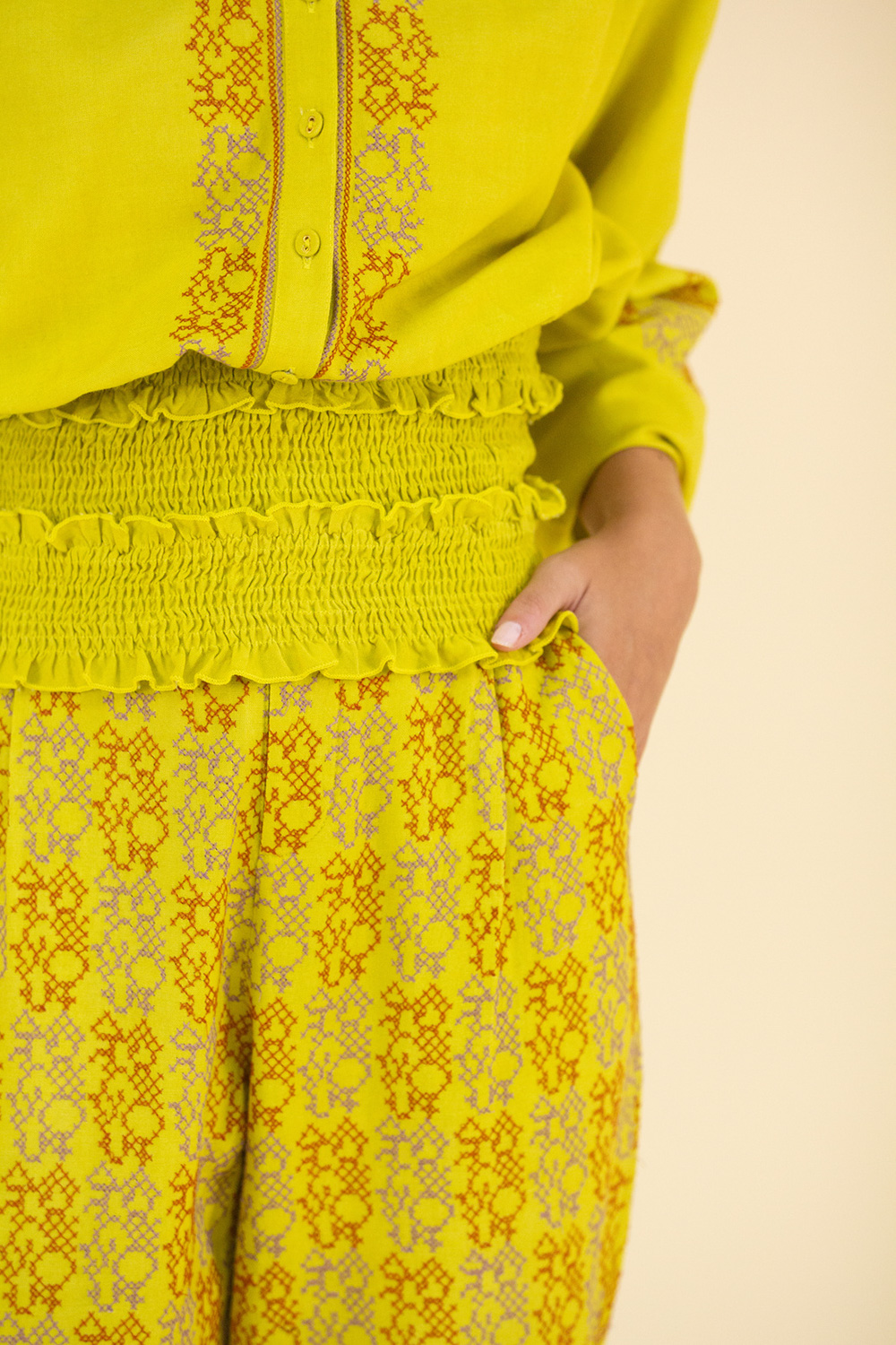 Descubre la versatilidad de este set que combina un top con botonadura delantera y cintura fruncida efecto nido de abeja, junto a pantalones bordados en punto de cruz con pinzas y bolsillos laterales. Perfecto para un look fresco y cómodo, este conjunto es ideal para brillar en cualquier ocasión. ¡Hazlo tuyo!
