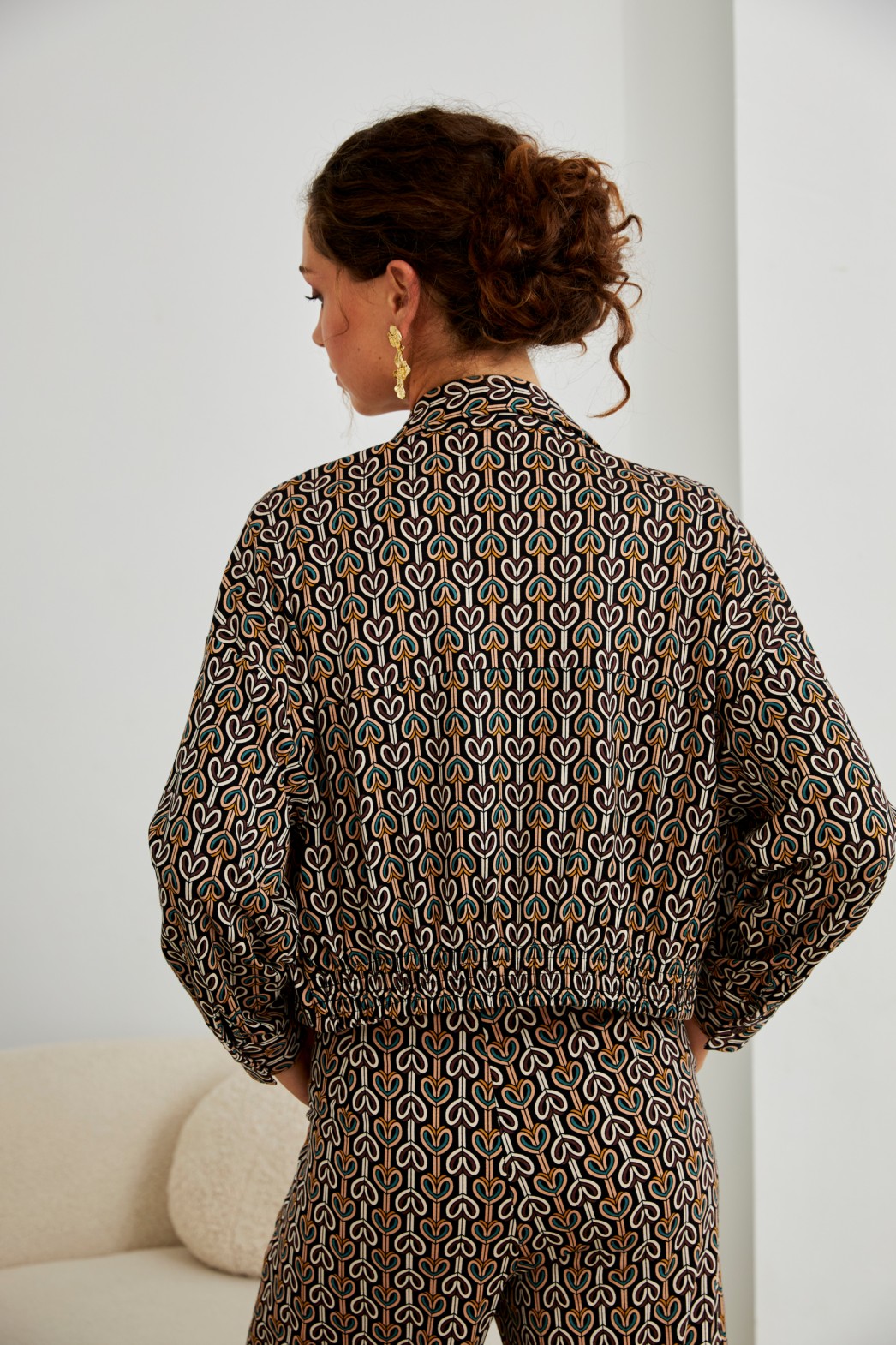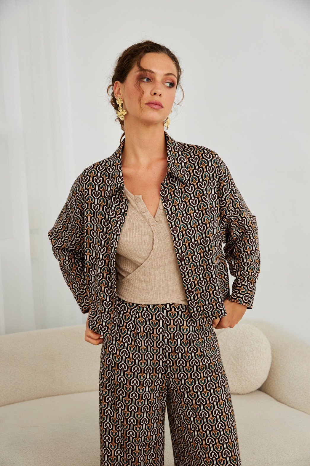El conjunto está compuesto por un top marrón ajustado, un blazer de terciopelo en tono marrón rosado y unos pantalones anchos estampados con un patrón geométrico en tonos marrón, negro y blanco. El look combina texturas ricas con un estilo relajado y sofisticado.