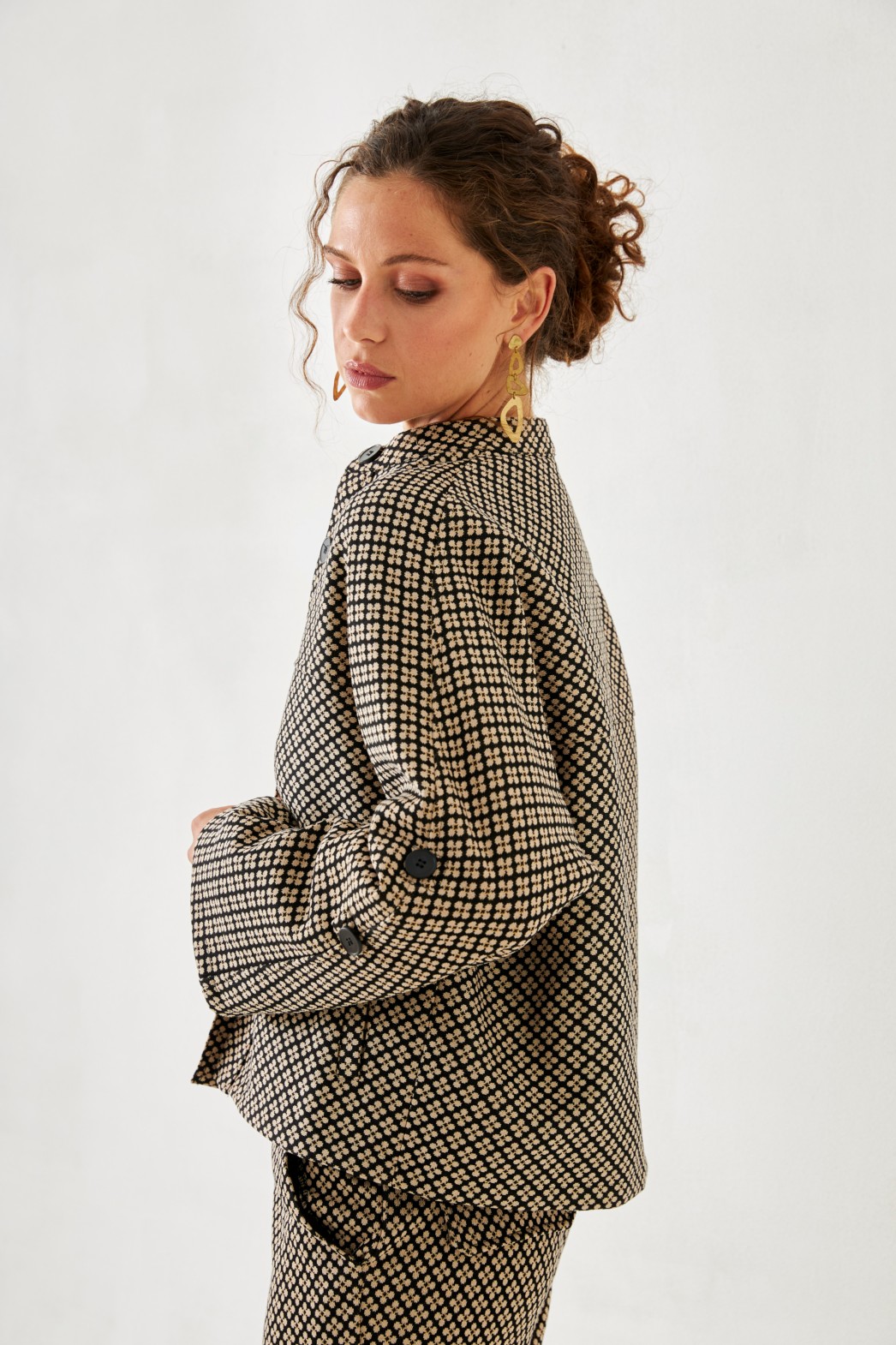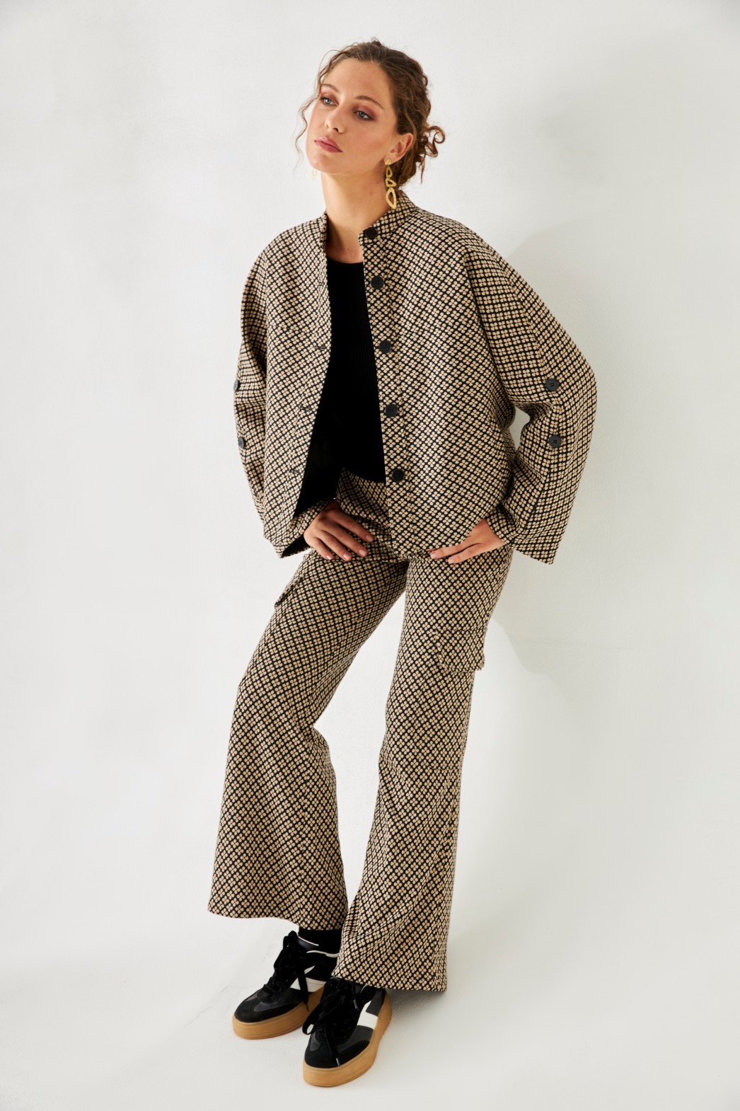 El conjunto de punto que lleva la modelo está compuesto por una chaqueta de corte amplio y pantalón de pierna ancha, ambos confeccionados en un tejido de punto grueso con un estampado geométrico en forma de rombos pequeños en tonos beige y negro. La chaqueta tiene un diseño relajado, con cuello alto tipo mao, cierre frontal con botones grandes y mangas largas con detalle de botones en los puños, lo que le aporta un aire moderno y estructurado. El pantalón es de tiro alto, ligeramente acampanado y con bolsillos tipo cargo en los laterales, que suman funcionalidad y estilo casual. El conjunto se completa con zapatillas deportivas de plataforma, creando un look cómodo, actual y con un toque retro.