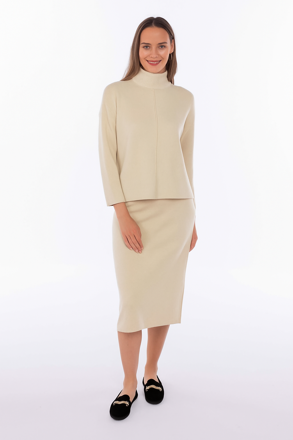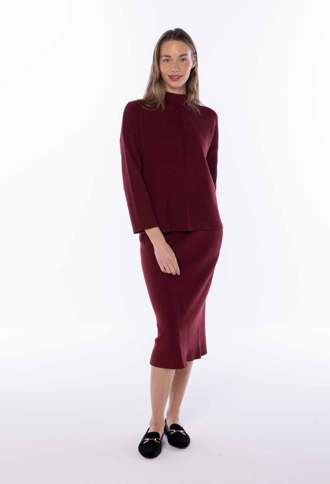 El conjunto está compuesto por un jersey de punto de manga larga con cuello subido y una falda recta de largo midi. El jersey presenta un diseño limpio con costuras decorativas en la parte frontal que aportan un detalle sutil y elegante. La falda, de corte entallado, realza la silueta manteniendo comodidad gracias a la elasticidad del tejido. Es un conjunto sofisticado y versátil, ideal para lucir tanto en un entorno profesional como en ocasiones más formales.