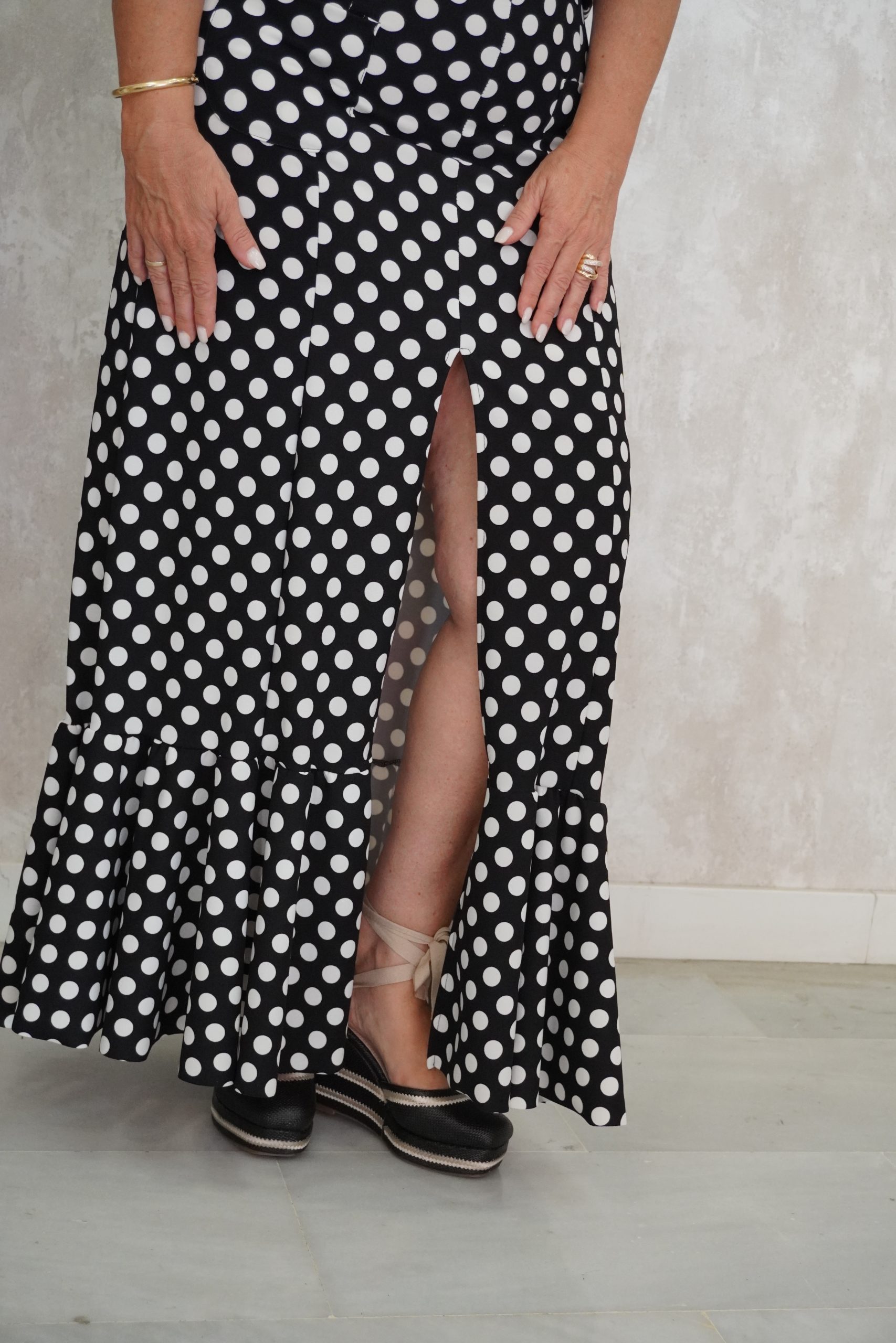 La falda larga a juego presenta una cintura alta, una abertura central que aporta movimiento y frescura, y termina en un delicado volante con caída, evocando la estética flamenca con un giro contemporáneo. Perfecto para eventos de feria, romerías, o incluso para un look casual chic con mucho carácter.