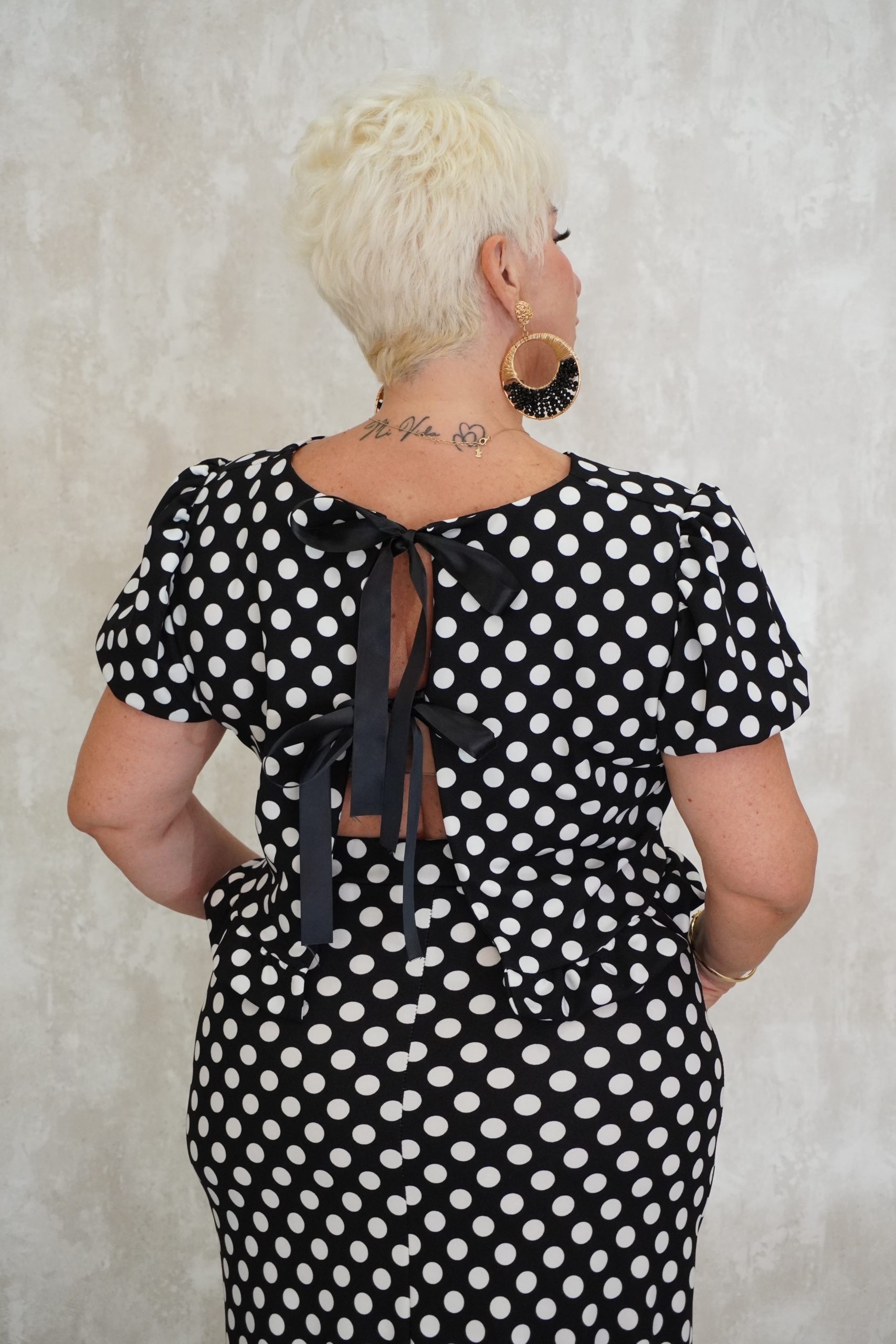 Este moderno y femenino conjunto de lunares combina tradición y estilo actual en una propuesta versátil y llamativa. Confeccionado en tejido fluido y cómodo, está compuesto por un top corto de manga abullonada con estampado de lunares blancos sobre fondo negro, que realza la silueta con un toque coqueto.