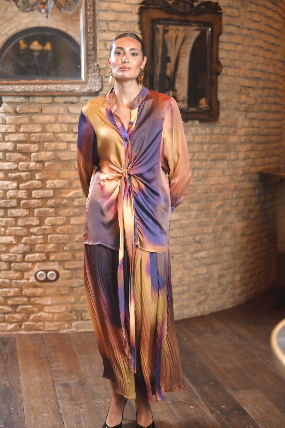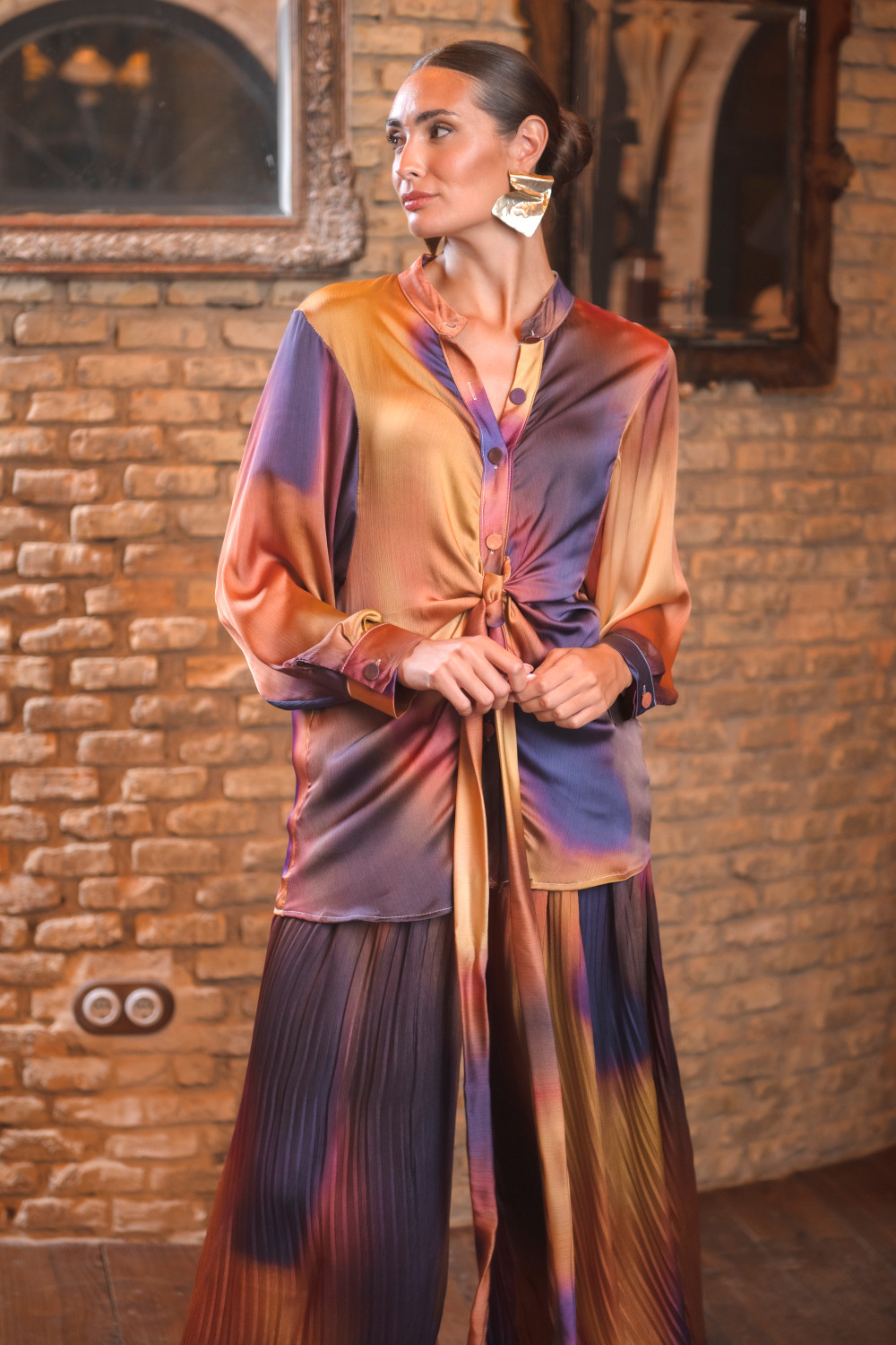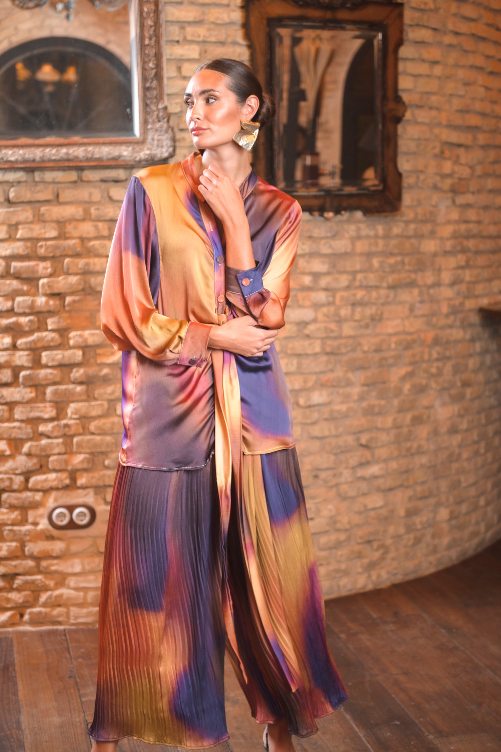 El diseño se distingue por un estampado difuminado en tonos azafrán, morado, mostaza y matices cálidos que se mezclan en un efecto degradado artístico. Este contraste de colores intensos y vibrantes crea un look sofisticado y llamativo, ideal para ocasiones especiales o para destacar en un estilo casual chic.
