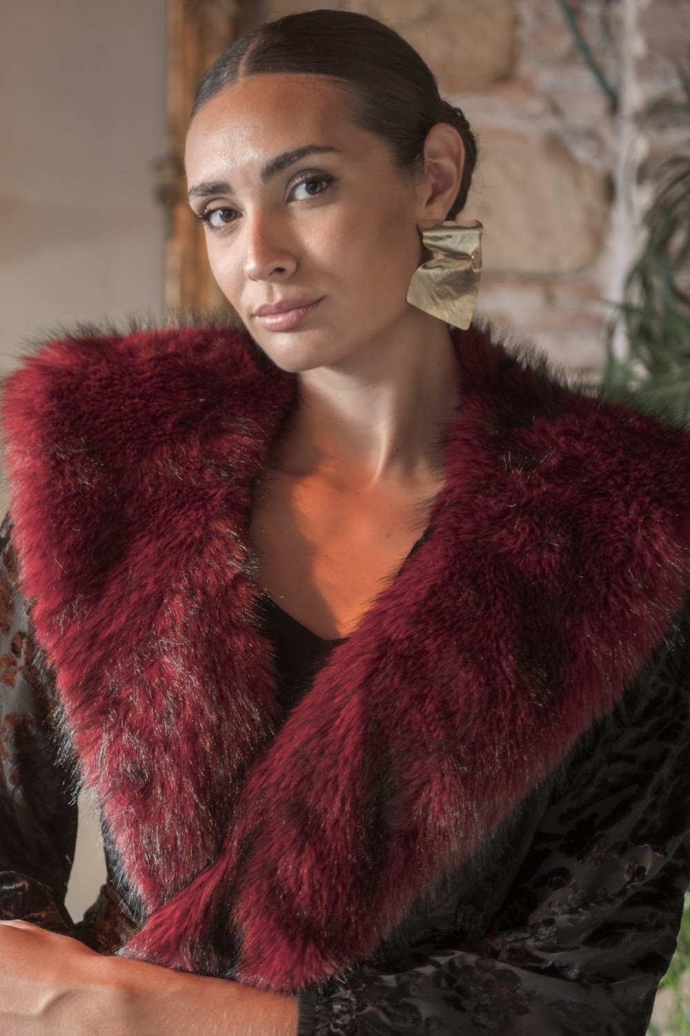 El cuello está diseñado con un acabado de pelo sintético largo y esponjoso, que aporta volumen y una sensación de calidez envolvente. Su textura suave y lujosa lo convierte en un detalle protagonista, ideal para añadir un aire sofisticado y elegante a cualquier prenda.