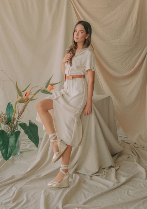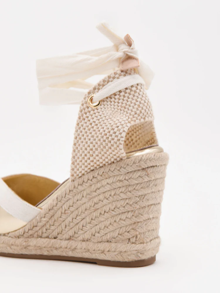 Estas alpargatas de cuña doradas son la opción ideal para quienes buscan un equilibrio entre comodidad y estilo sofisticado. Con una punta en acabado dorado metalizado y cintas ajustables en tono natural que se atan al tobillo, ofrecen un toque femenino y elegante. La suela de esparto y la cuña alta garantizan una pisada estable y confortable, perfecta para el verano.