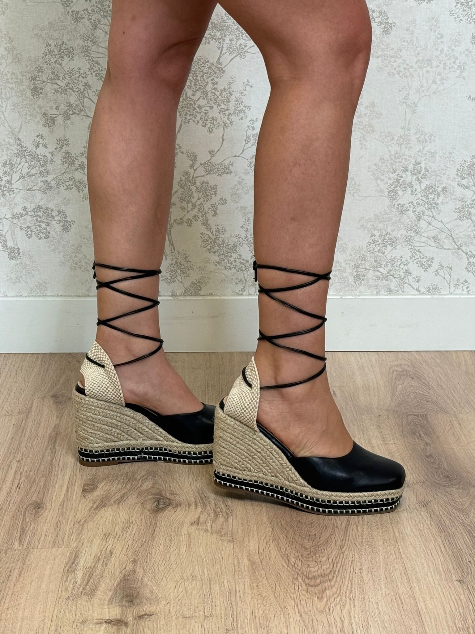 Cuñas estilo alpargata con punta cerrada, detalle de cintas al tobillo, plataforma de yute trenzado y ribetes en contraste. Elegantes y cómodas para tus looks de verano.
