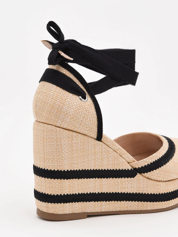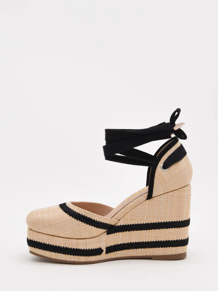 Estas alpargatas de cuña son la combinación perfecta entre comodidad y estilo veraniego. Confeccionadas en un tono natural con detalles de cintas negras que se atan al tobillo, aportan un toque sofisticado y femenino.