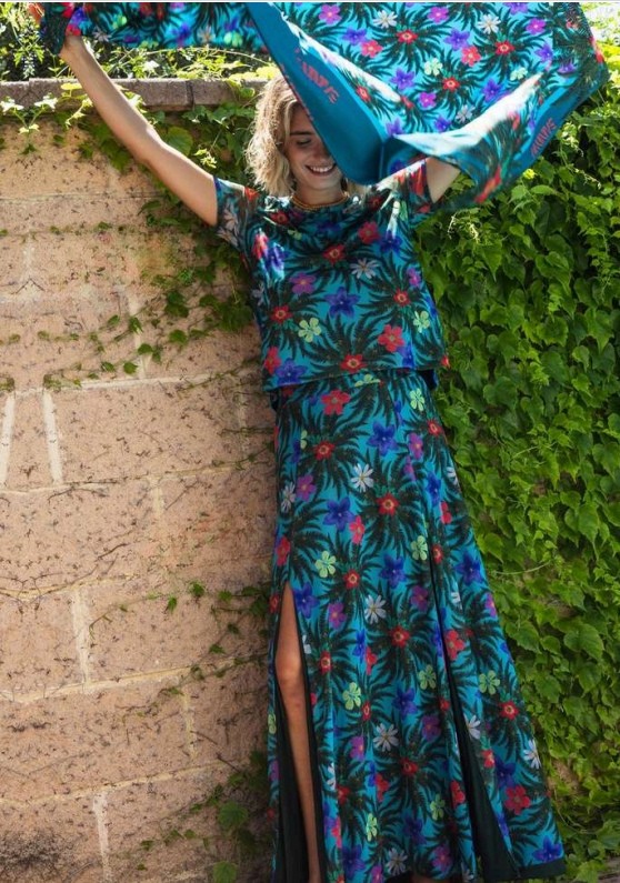 Falda larga y fluida que fusiona comodidad con elegancia tropical.