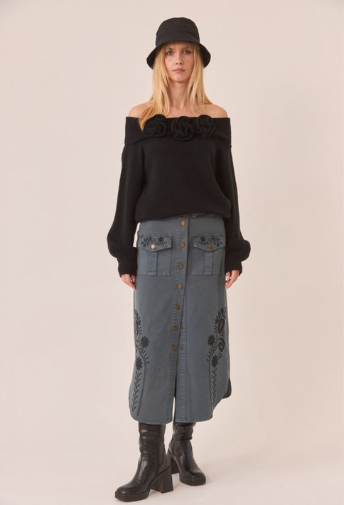 La falda que aparece en las imágenes tiene un estilo vintage y bohemio. Confeccionada en un material tipo denim, tiene un corte largo, que llega justo por debajo de la rodilla. Destacan sus detalles bordados en tonos oscuros, como flores y hojas, que adornan el costado y le dan un toque de sofisticación. Además, cuenta con botones frontales metálicos, lo que le da un aire más estructurado y elegante. Los bolsillos en la parte superior añaden un detalle práctico y estiloso, complementando el diseño con un aire utilitario. Es una pieza versátil que se puede combinar con prendas más sencillas o con elementos más modernos, como botas de tacón, para un look completo.