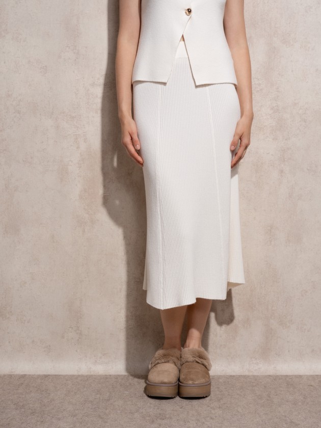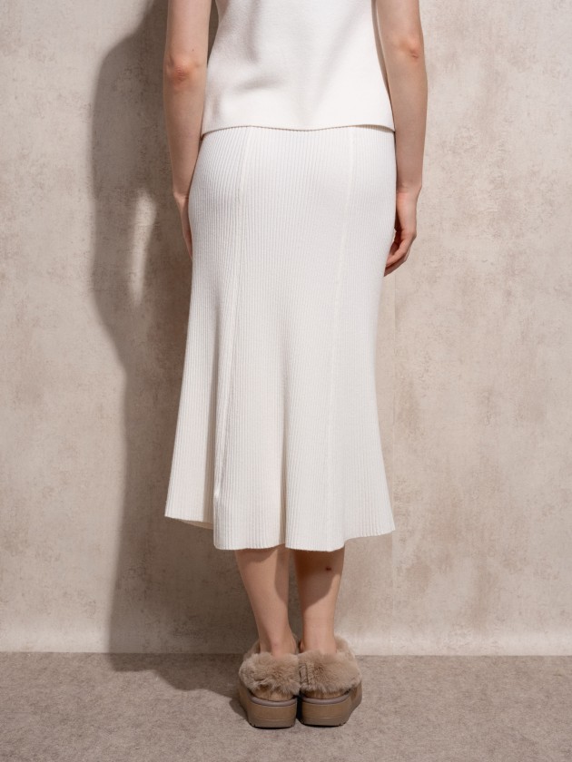 Falda midi de punto acanalado, con textura suave y ajuste cómodo. Su diseño estructurado realza la silueta manteniendo una caída natural y elegante, ideal para combinar con prendas básicas o más formales.