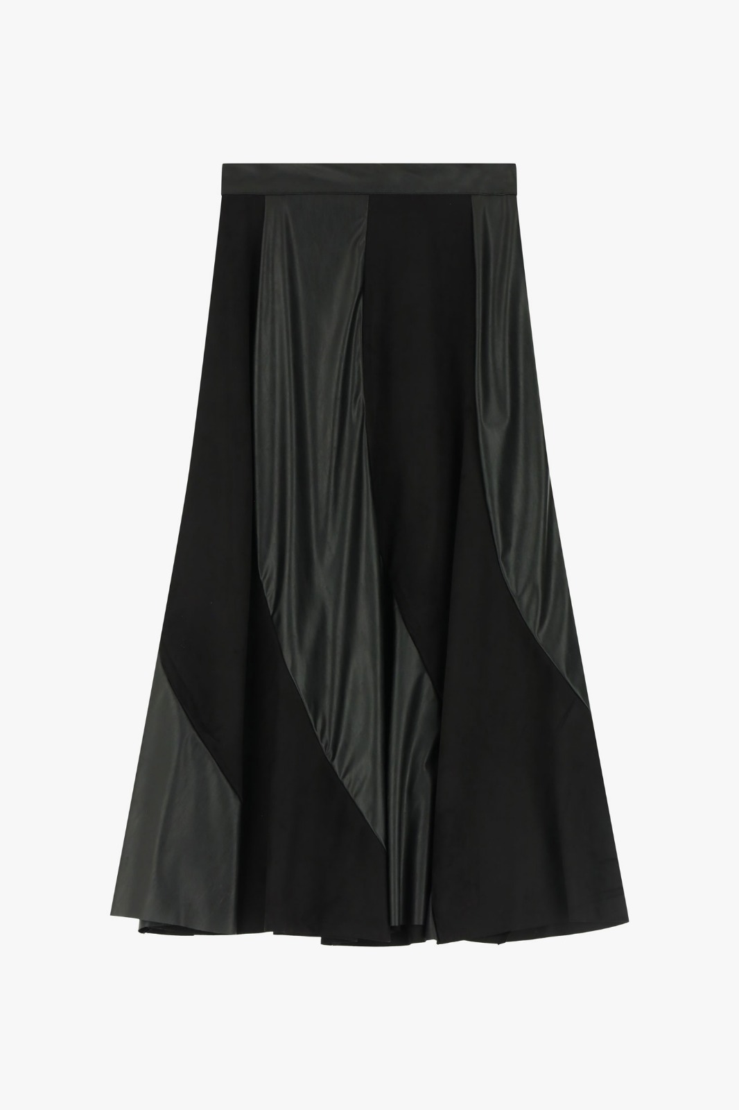 Falda de corte evasé con diseño de paneles en contraste que aportan un efecto dinámico y sofisticado. Su confección combina diferentes texturas que generan movimiento y originalidad en cada paso. La cintura es lisa y definida, lo que realza la silueta y equilibra el volumen del bajo. Una prenda versátil y con carácter, perfecta para looks modernos y elegantes.