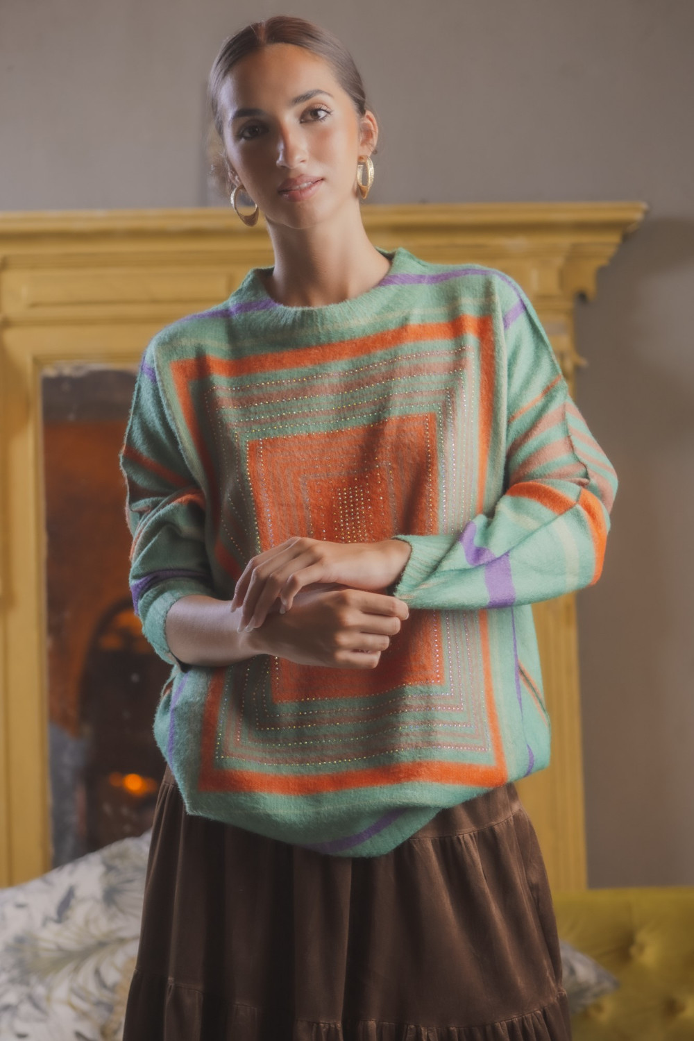 El jersey en la imagen es de color blanco cremoso con un diseño floral en tonos cálidos. Las flores, que están ubicadas en la parte superior del suéter, tienen detalles en lentejuelas que añaden brillo y textura, combinados con bordes en tonos oscuros que realzan el diseño. Es un suéter de manga larga con un corte amplio y cómodo, lo que le da un toque casual y moderno. Este tipo de suéter es ideal para un look relajado pero con estilo, complementado perfectamente con un par de pantalones color beige o marrón, como los que se muestran en la foto.
