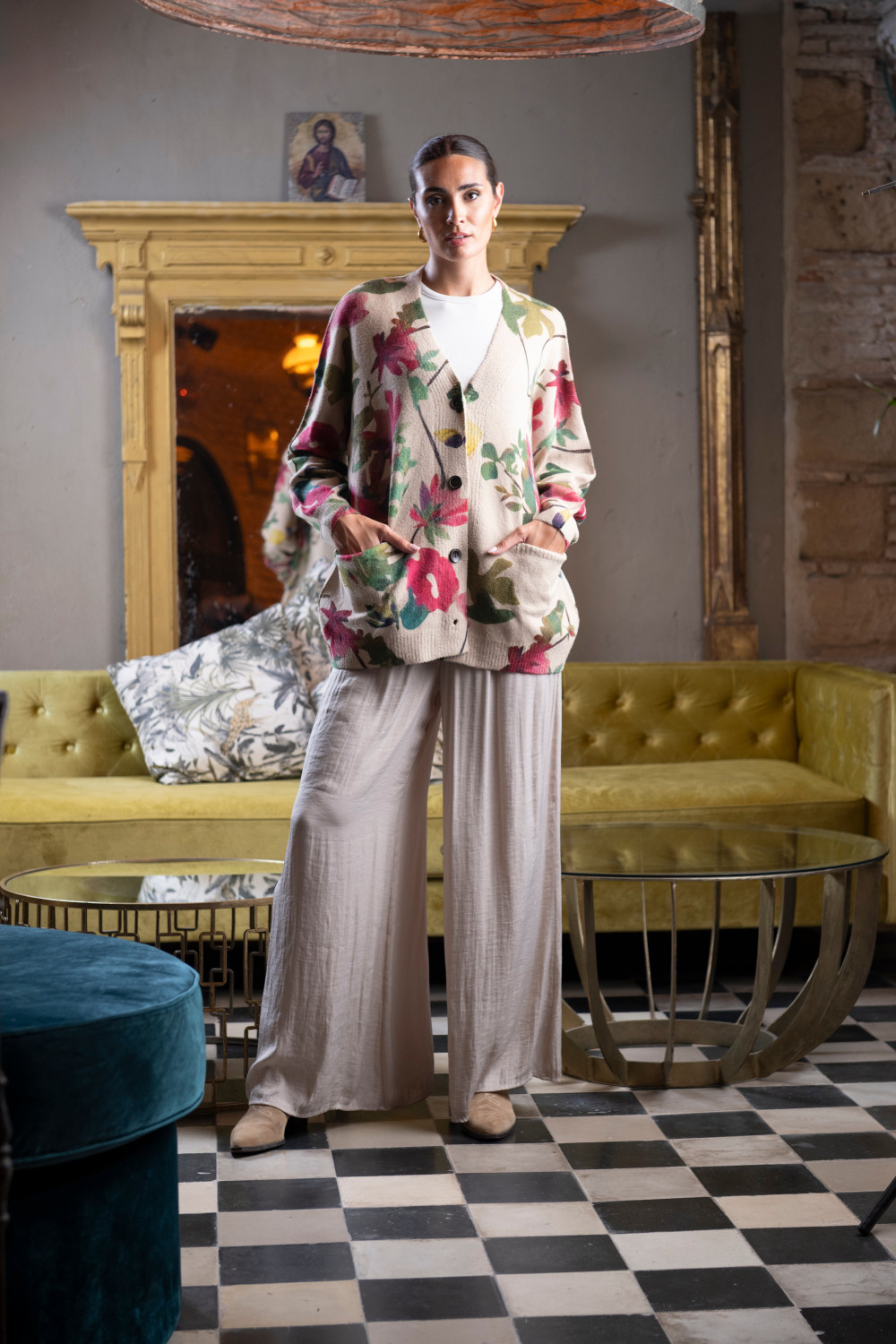 Destaca por su estampado floral en tonos vibrantes como buganvilla, verde y mostaza sobre una base neutra, creando un contraste alegre y sofisticado. Incluye bolsillos frontales funcionales, ideales para mayor comodidad y un toque casual.