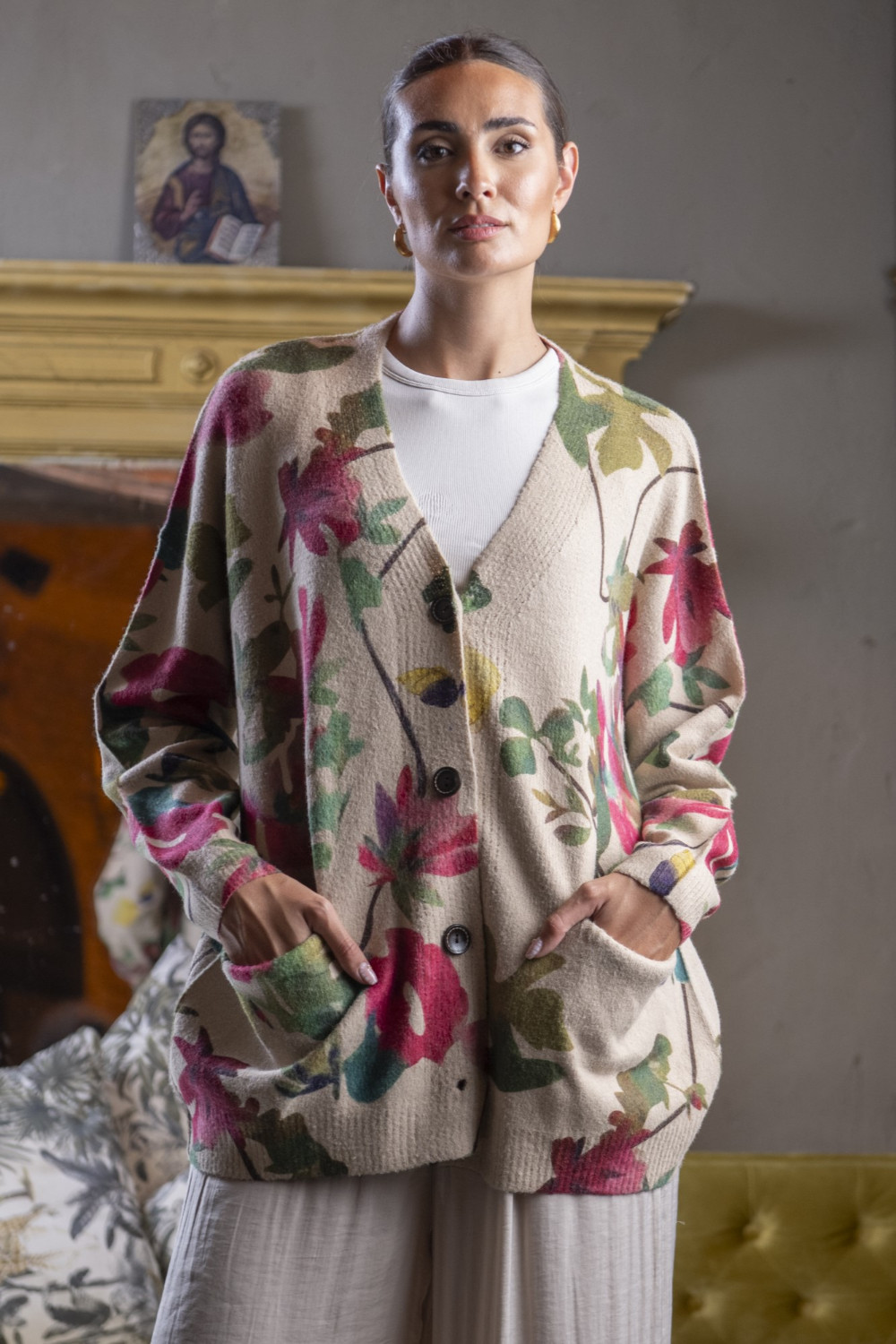 Es un abrigo tipo cárdigan de talla única, confeccionado en un tejido suave y confortable que combina estilo y comodidad. Su diseño presenta un corte holgado y relajado, con escote en pico y cierre frontal de botones grandes que aportan un aire clásico y práctico.